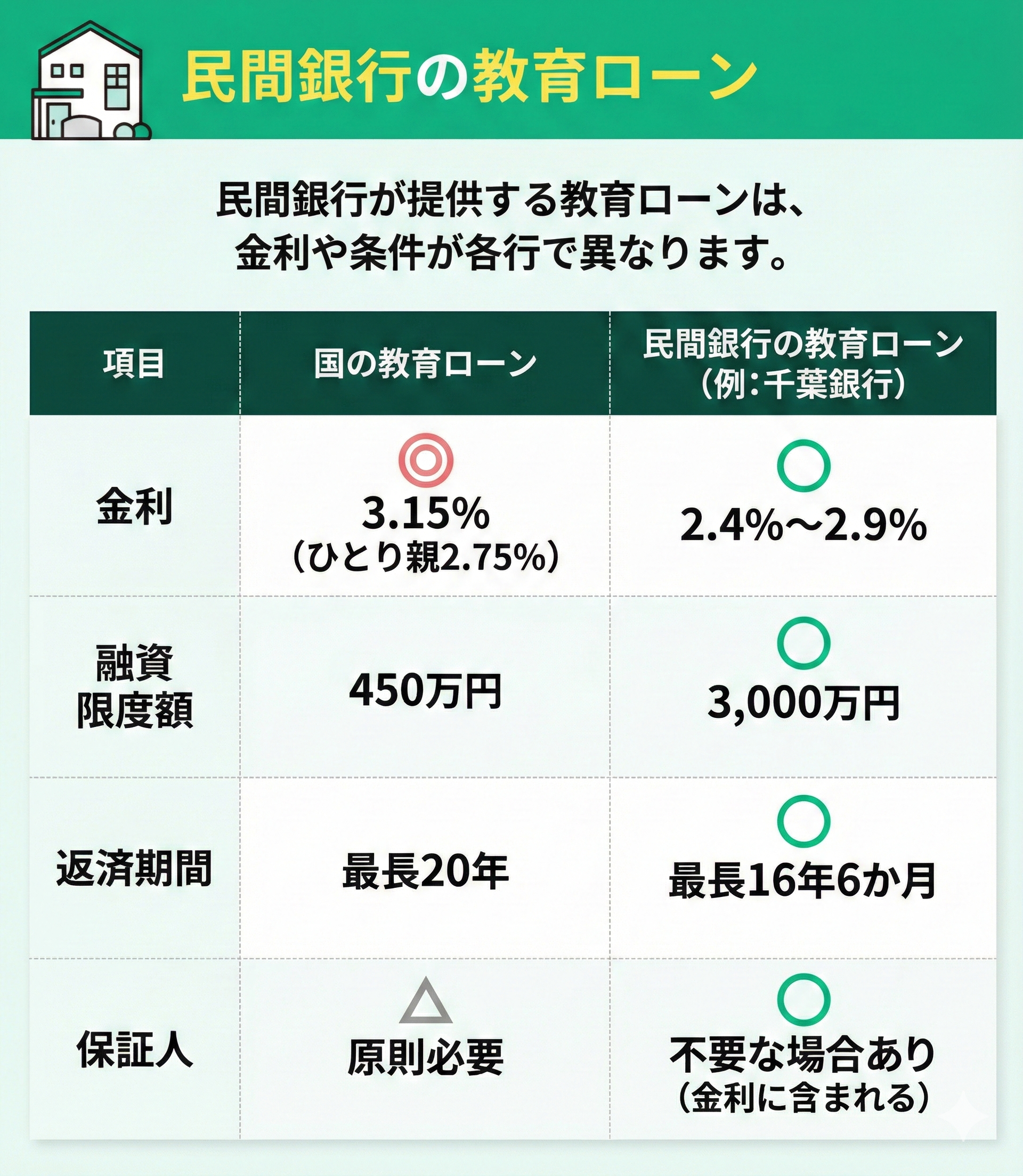 | 項目 | 国の教育ローン※1 | 民間銀行の教育ローン※2 (例:千葉銀行) |