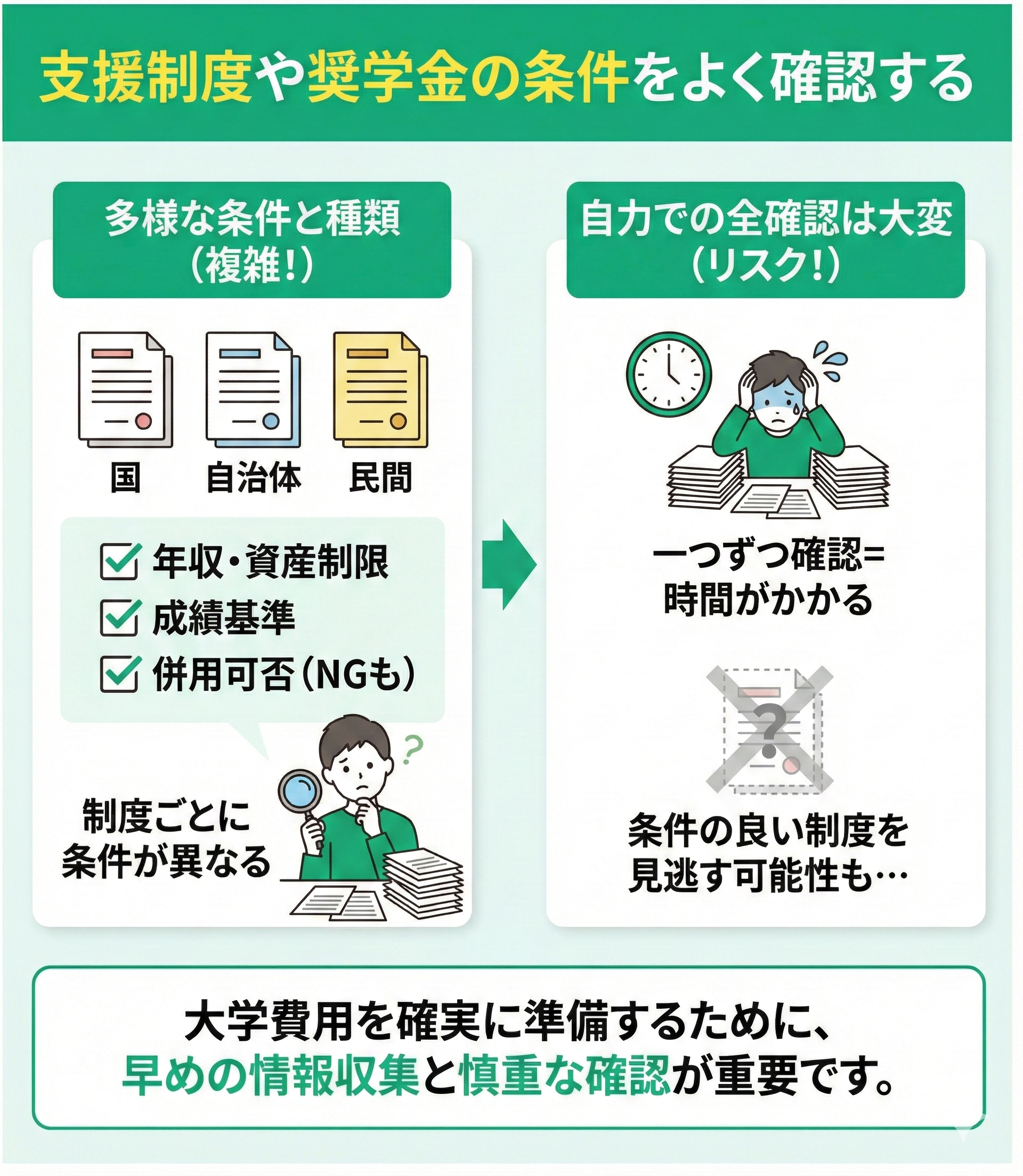 各支援制度や奨学金を利用するには、年収や世帯の資産などのさまざまな条件があります。