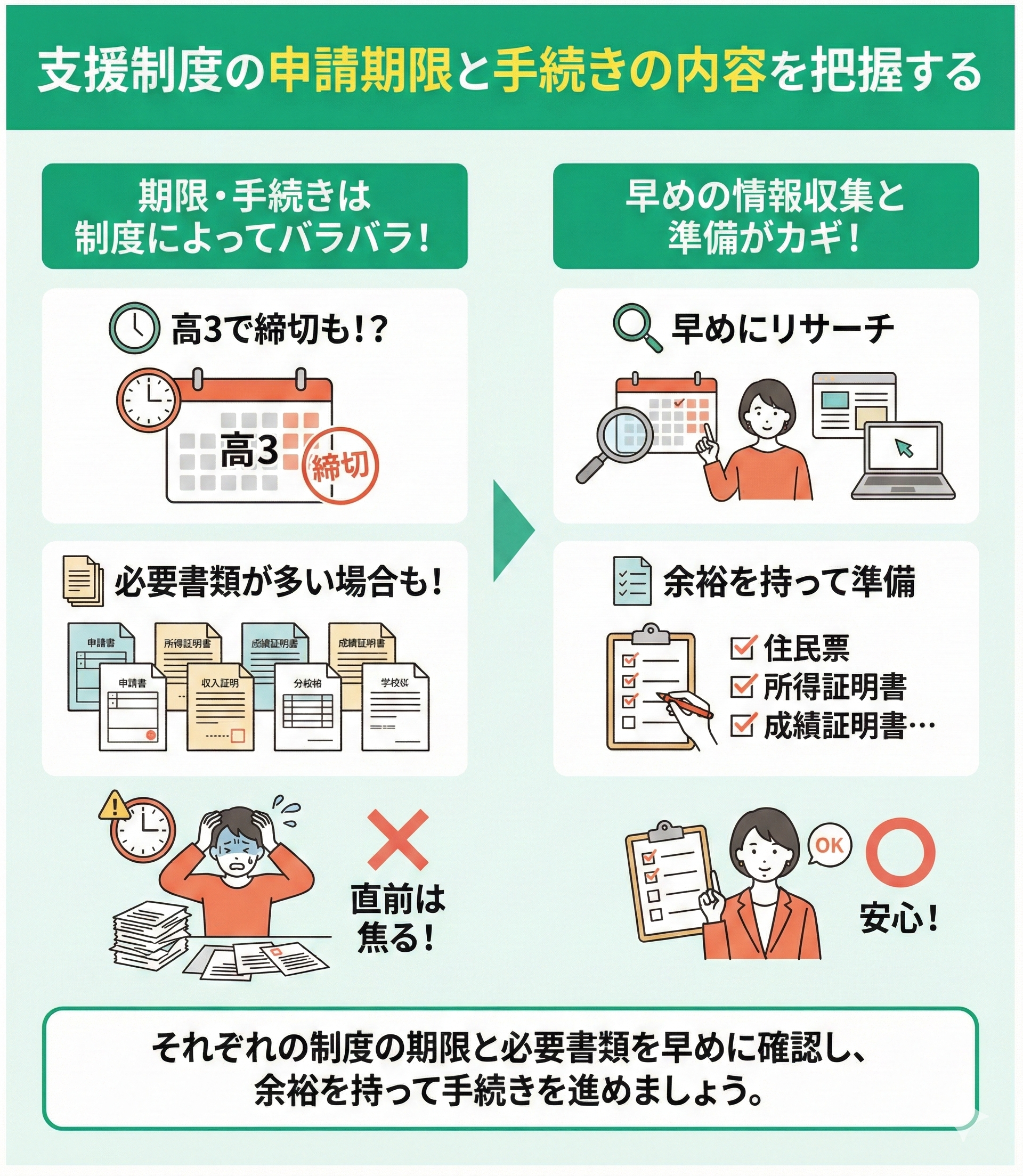 各支援制度や奨学金の申込期限や手続きの内容はまちまちです。