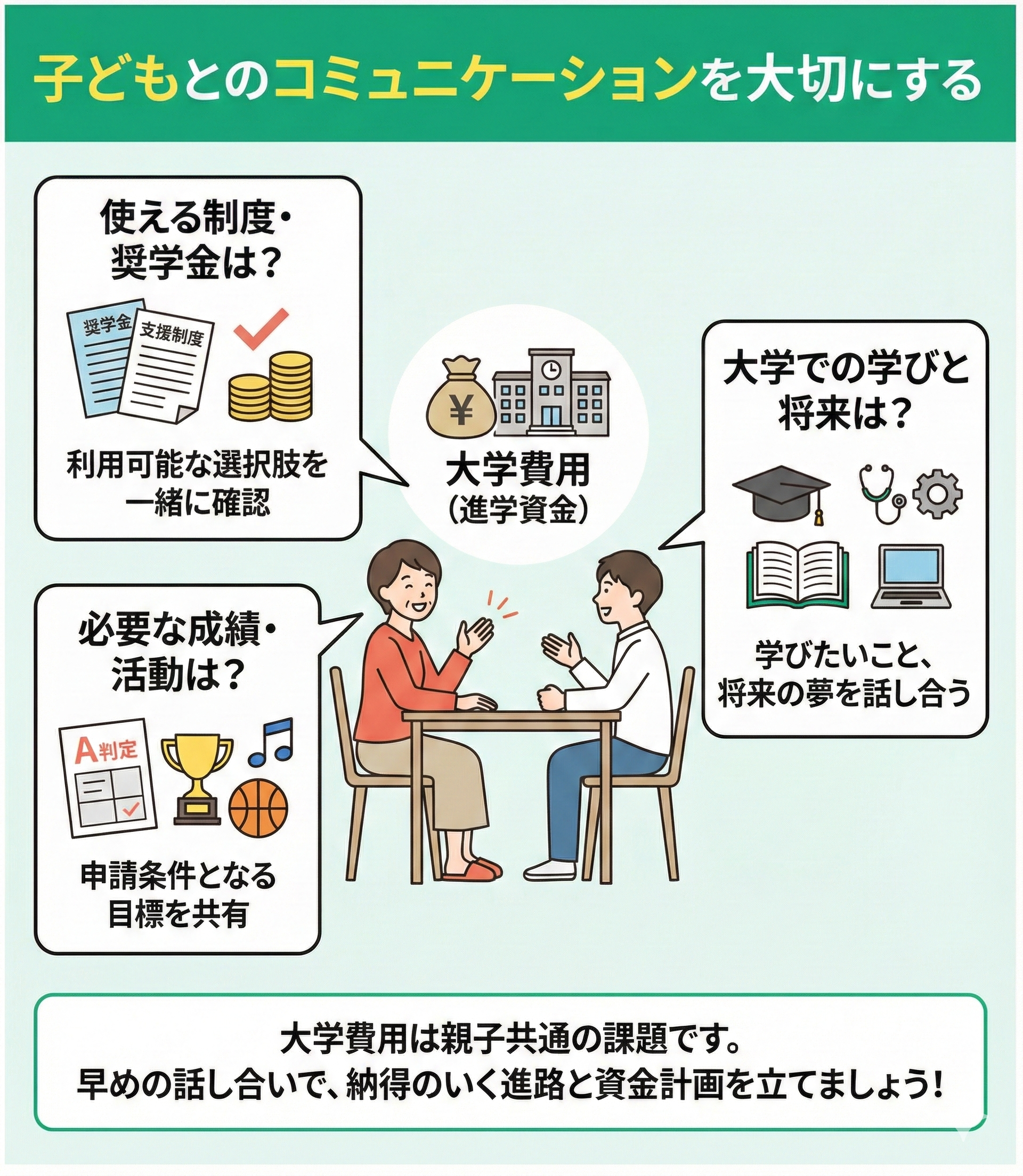 大学教育の費用全体について説明し、下記のことなどを親子で話し合うことが大切です。