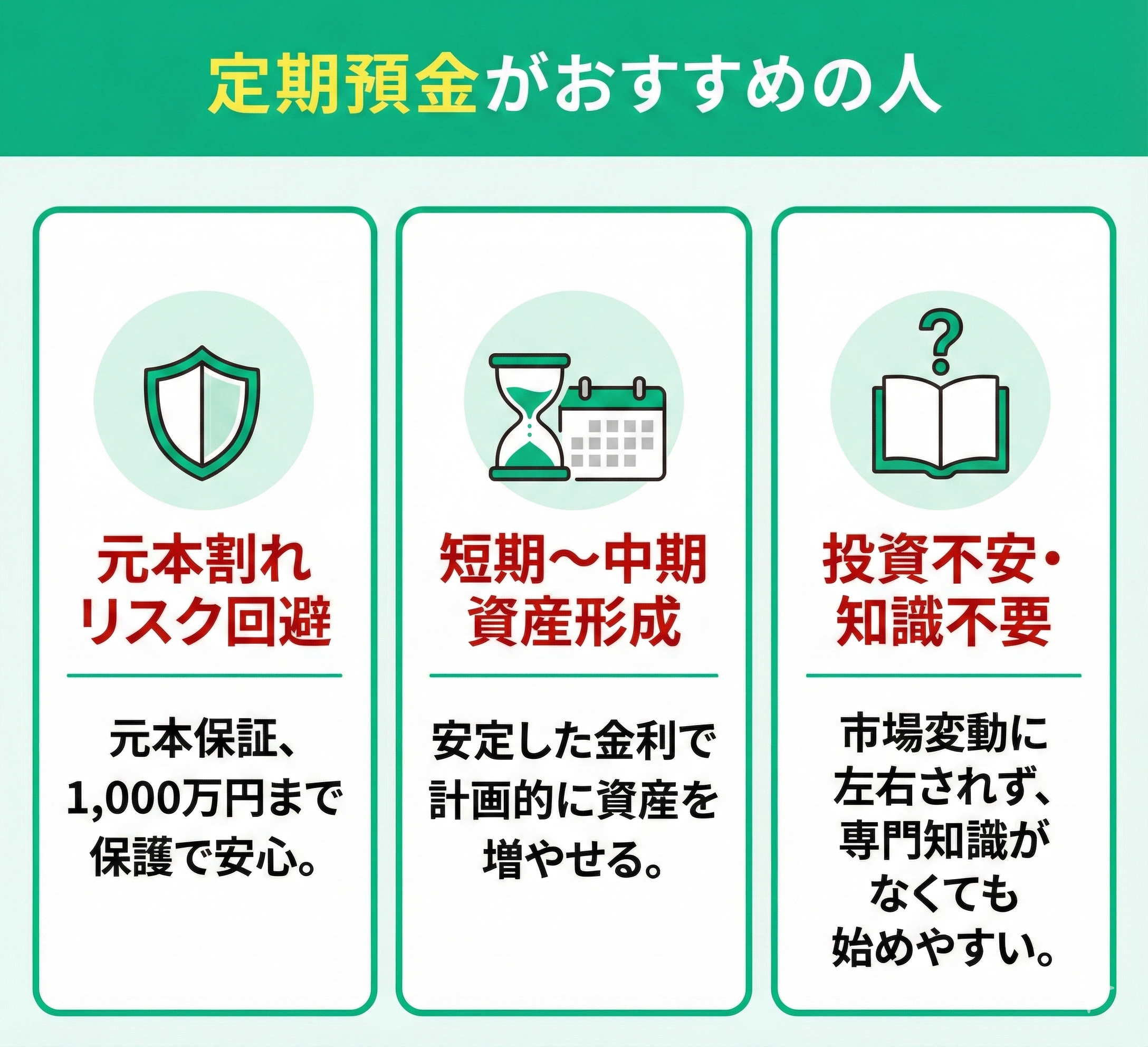 新NISAでの運用には、どうしても市場の影響による元本割れのリスクがつきまといます。その点、定期預金は元本が保証されており、預金保険制度によって1,000万円までは確実に守られるのが大きな強みです。