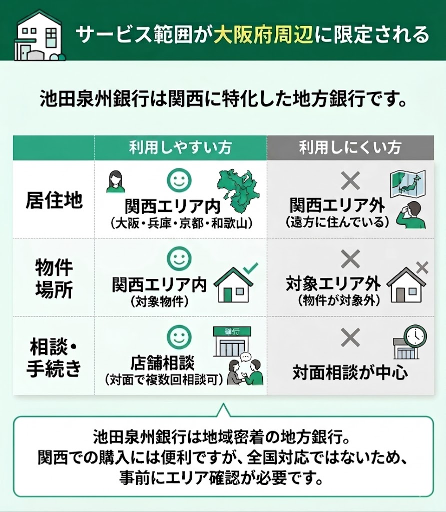 関西圏で住宅購入を考えている方にとっては相談しやすい一方で、エリア外に住んでいる方や、対象地域以外の物件を検討している方にとっては利用しにくい場合があります。