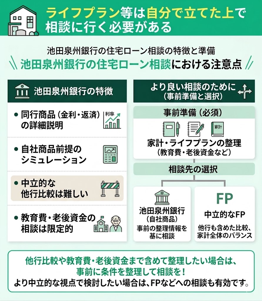 このように、池田泉州銀行とFPでは相談できる内容や強みが異なるため、自分の悩みや重視したいポイントに合った相談先を選ぶことが、後悔しない住宅ローン選びの第一歩となります。