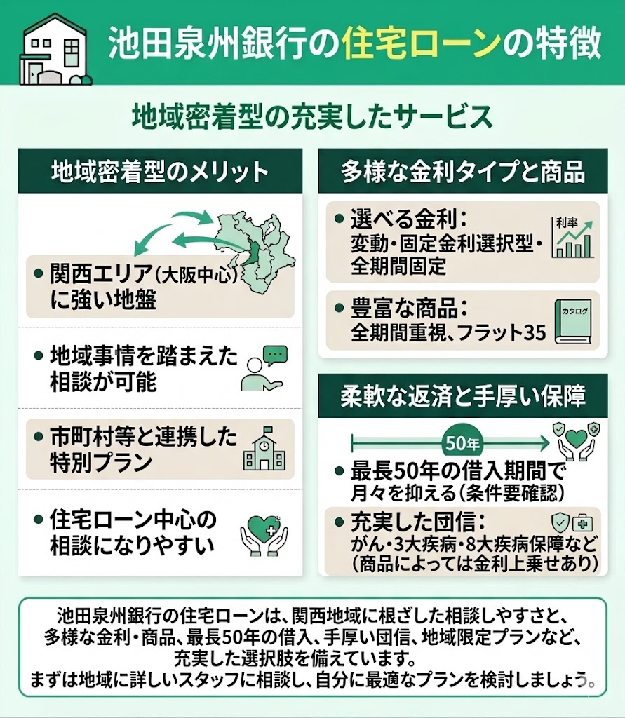 池田泉州銀行は、大阪府を中心に関西エリアで強い地盤を持つ地方銀行で、地域に根ざしたサービスを展開しています。住宅ローンでも、地域事情を踏まえた相談がしやすい点が特徴です。