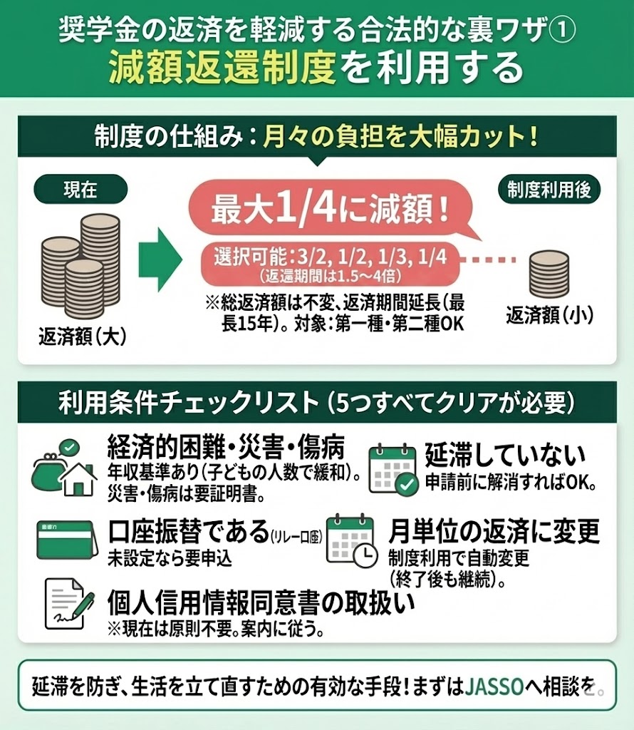 減額返還制度とは、災害・傷病・経済的理由などで返還が難しくなった場合に、月々の返還額を減額できる制度です。