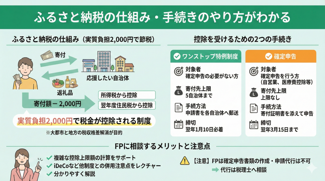 FPに相談すると、以下のようなふるさと納税の仕組み・手続きのやり方について、わかりやすいレクチャーを受けられます。