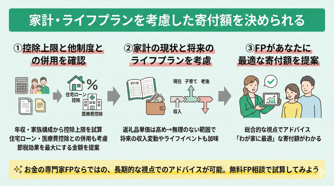 ふるさと納税についてFPに相談すると、家計・ライフプランを考慮した寄付額を決められます。