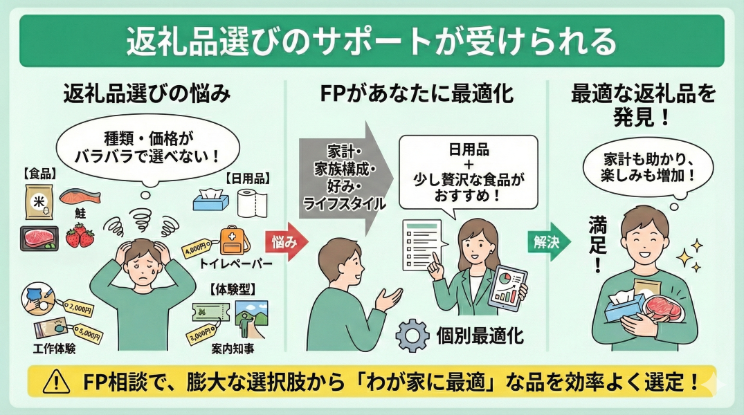 ふるさと納税についてFPに相談すると、返礼品選びのサポートが受けられます。