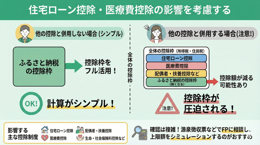 ふるさと納税は、住民税や所得税の控除を受けられるお得な制度。ですが、他の控除制度と併用すると控除枠が圧迫され、思っているより節税効果が得られない可能性があります。