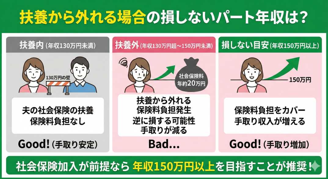 - 扶養から外れてしまうなら年収150万円以上を目指す