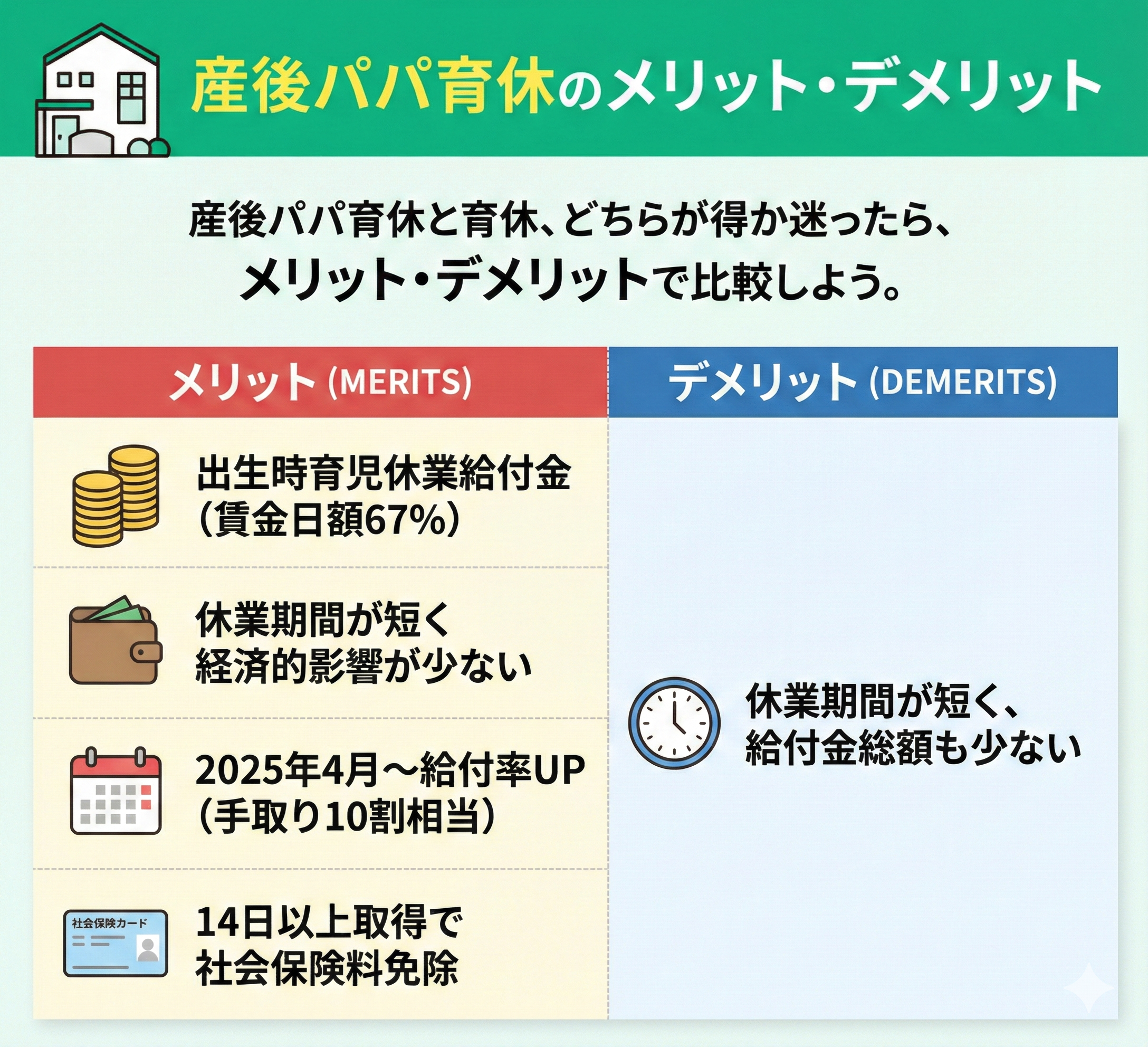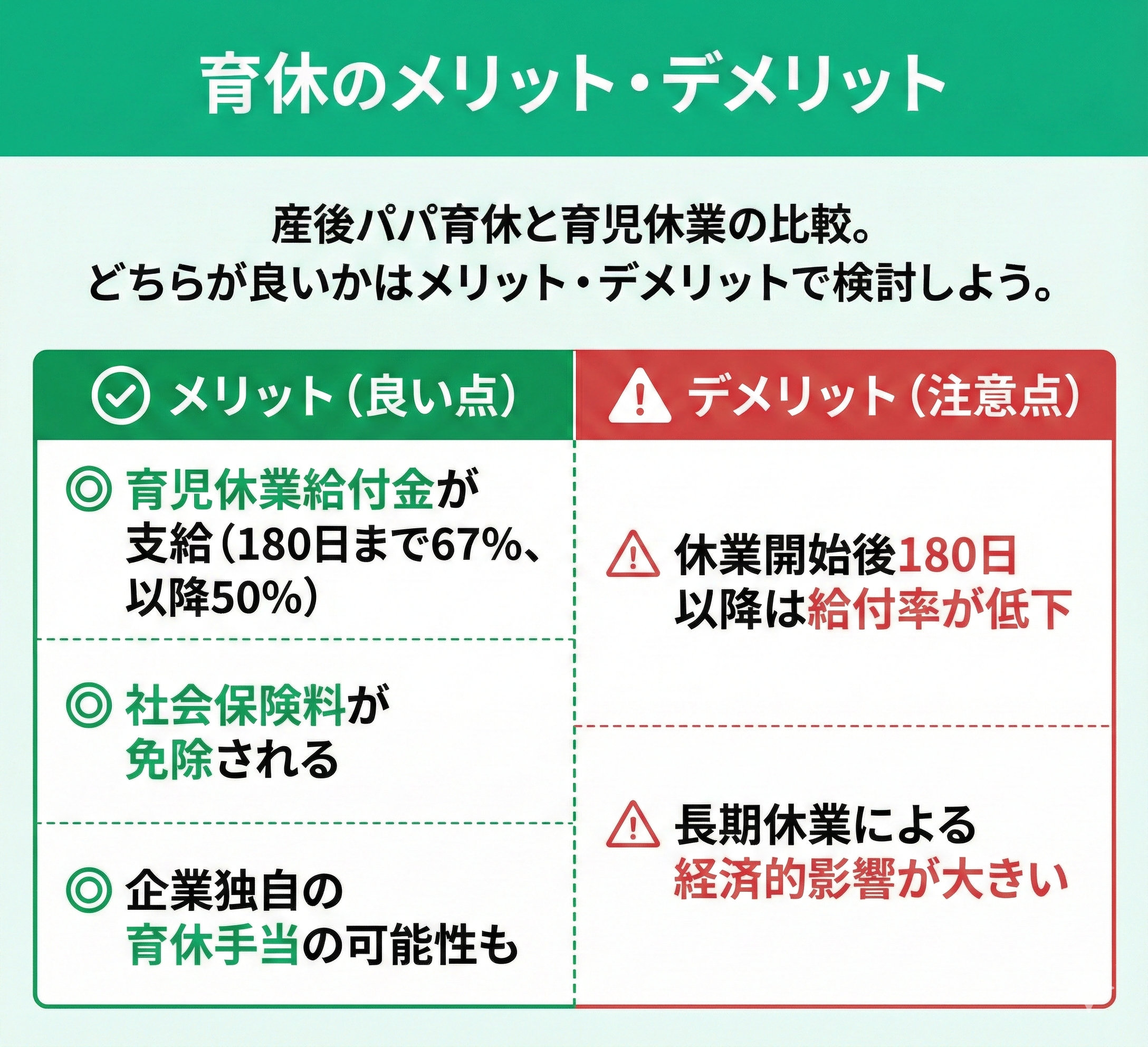 産後パパ育休と育児休業(育休)どっちが得なのか迷ったら、それぞれのメリット・デメリットを整理して検討しましょう。