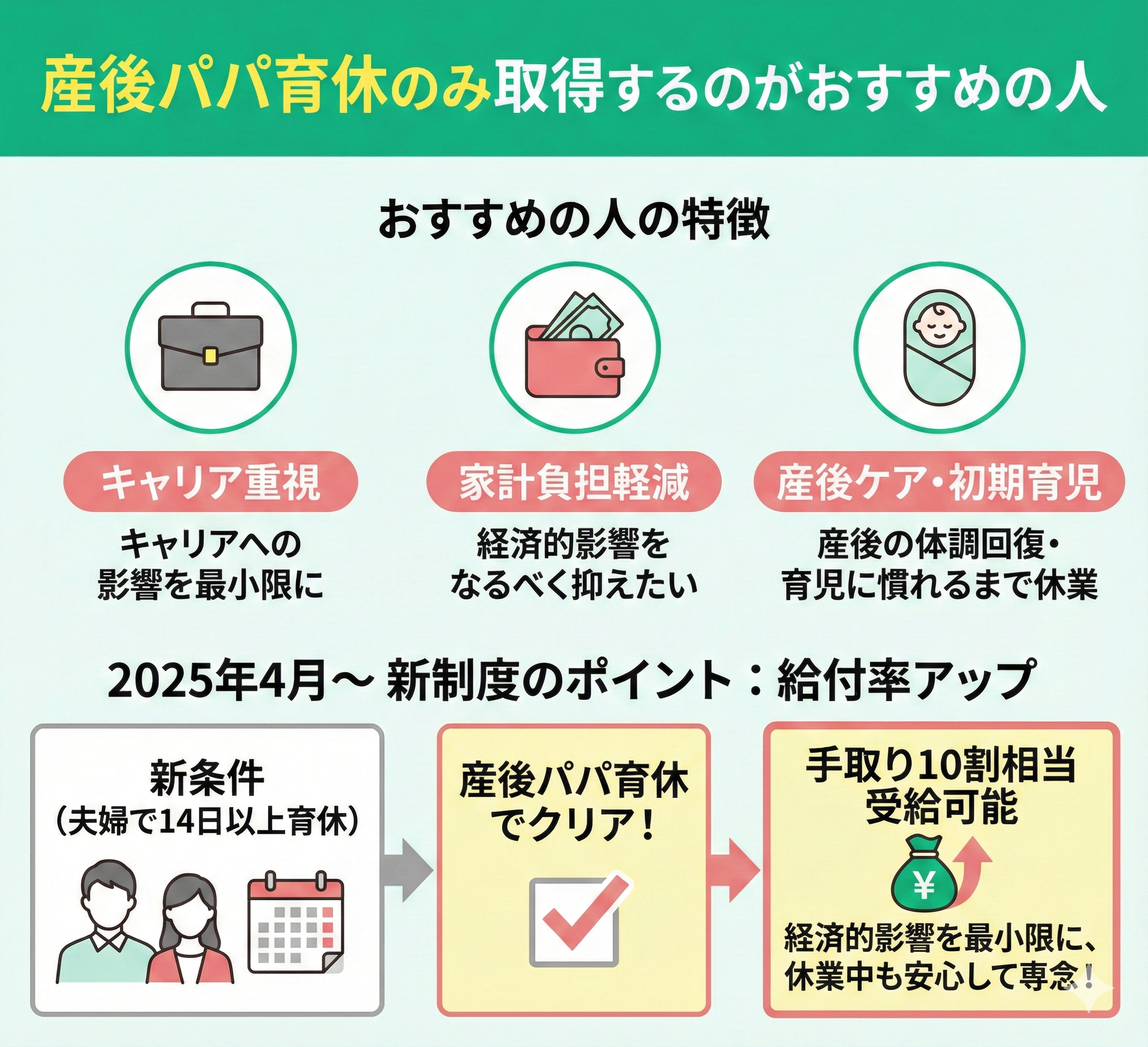 産後パパ育休のみ取得するのがおすすめの人の特徴として、下記が挙げられます。