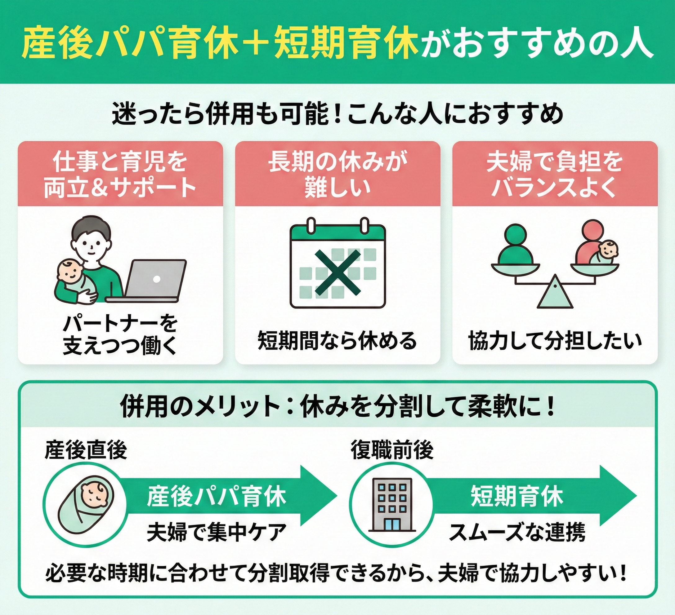 産後パパ育休と短期育休を併用すれば休みを分割して取得できるため、「産後直後」「復職前後」など、サポートが必要な時期に夫婦で協力して育児・家事に取り組めます。