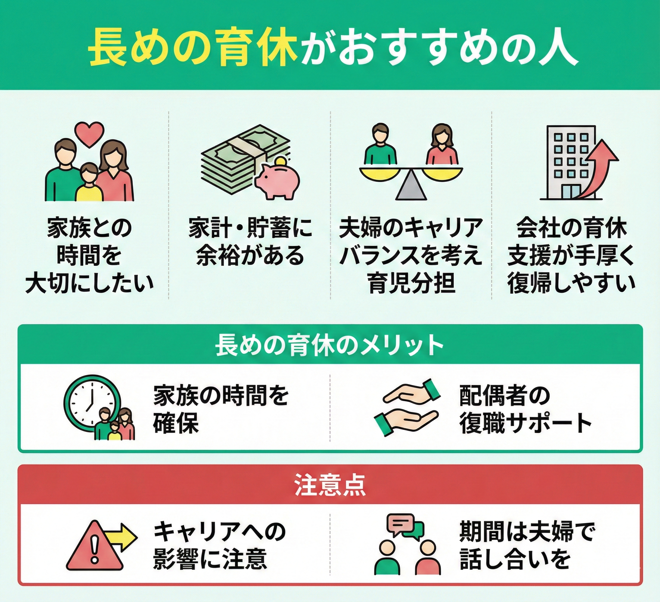 長めの育休を取得すれば、家族の時間を大切にできるほか、配偶者の復職サポートができるというメリットがあります。