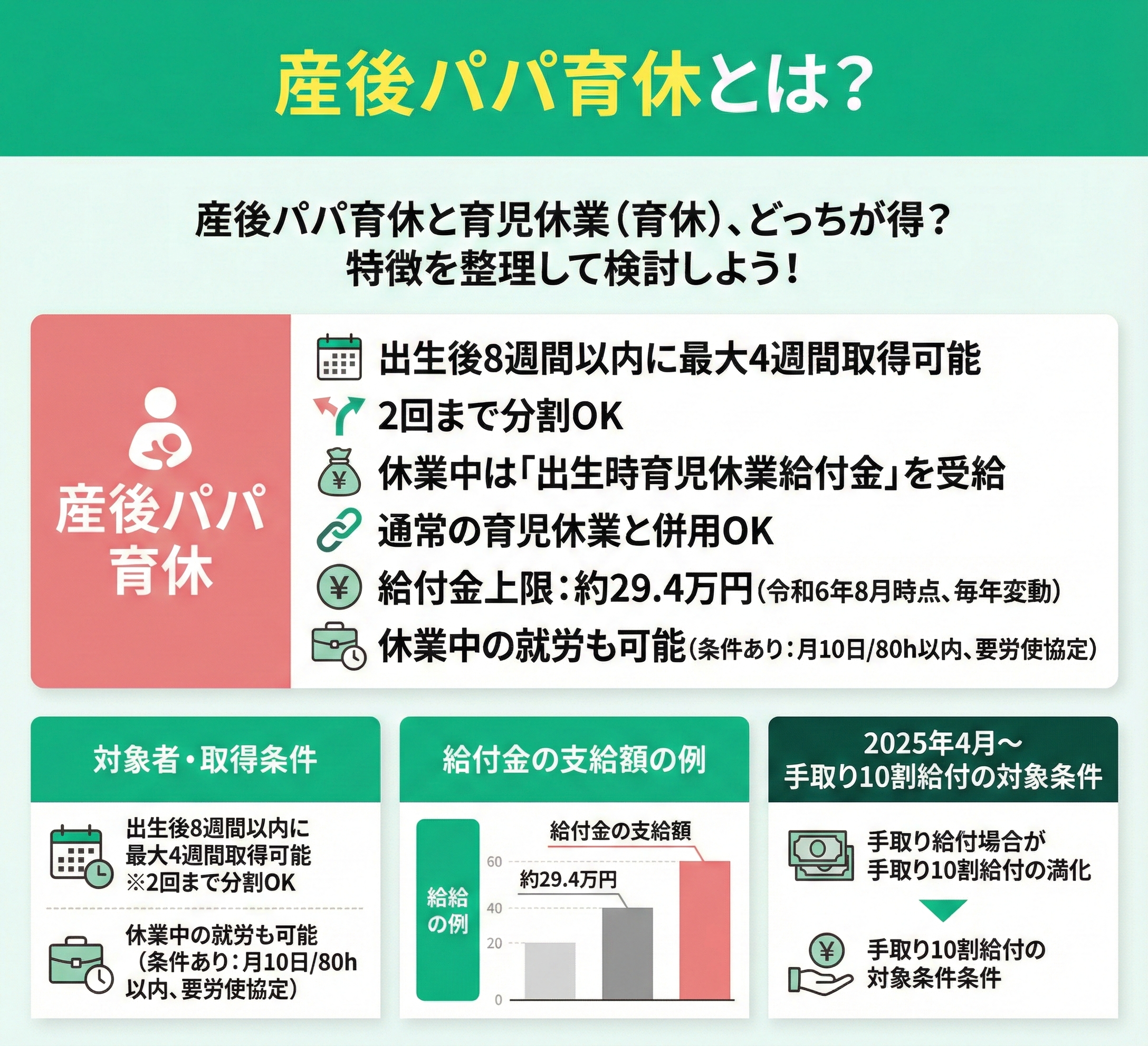 - 最大取得期間:産後パパ育休(4週間)+育休(1年間)で最大約13か月。