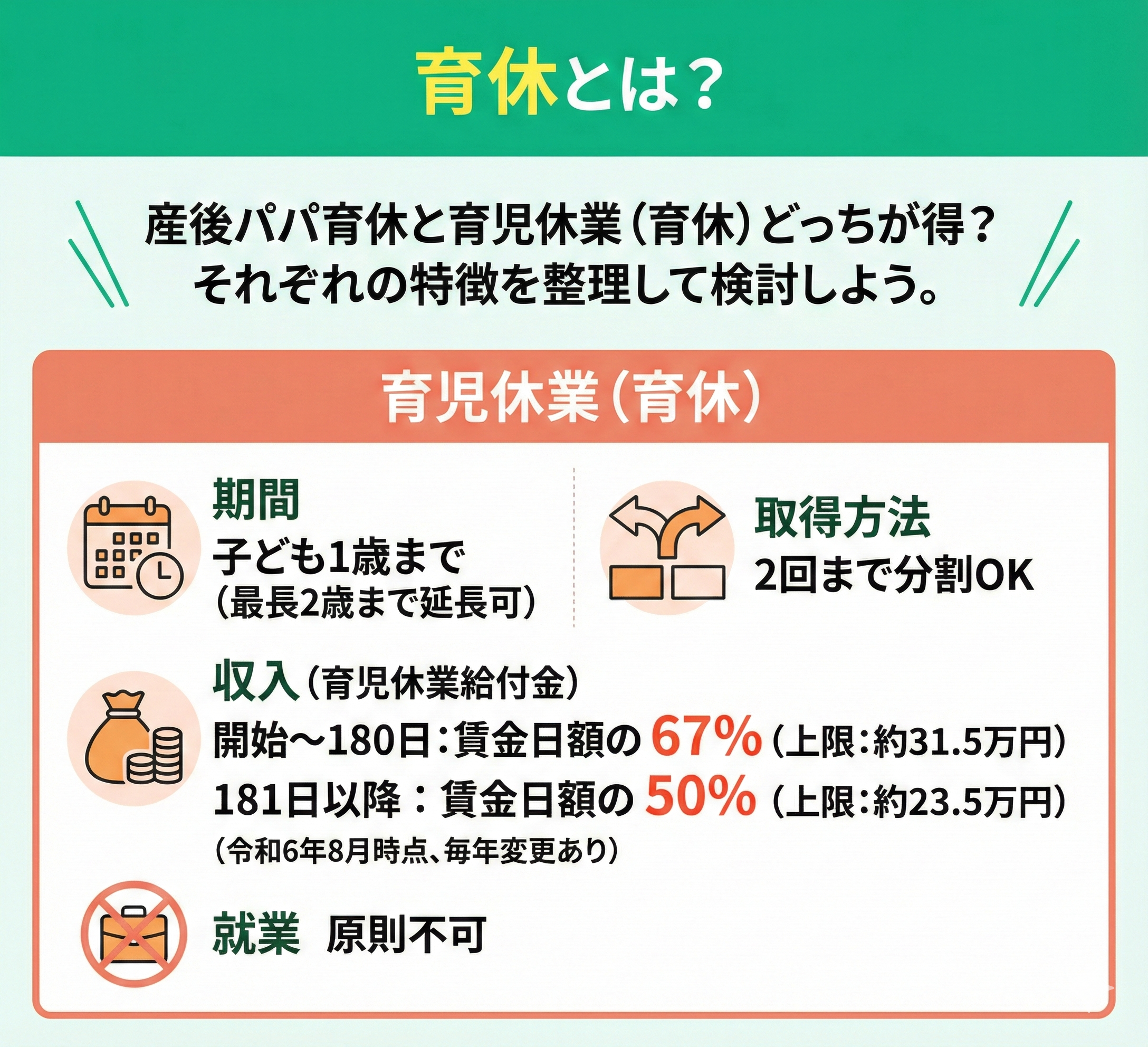 | 給付金 | 出生時育児休業給付金 (休業開始時賃金の67%) | 育児休業給付金 (開始から180日:67%、以降:50%) |