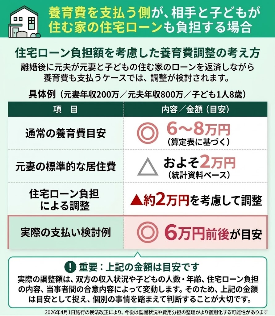 このケースでは、元夫が元妻と子どもの住む家の住宅ローンも負担しているため、住居費相当額を考慮して養育費額を調整する考え方がとられることがあります。