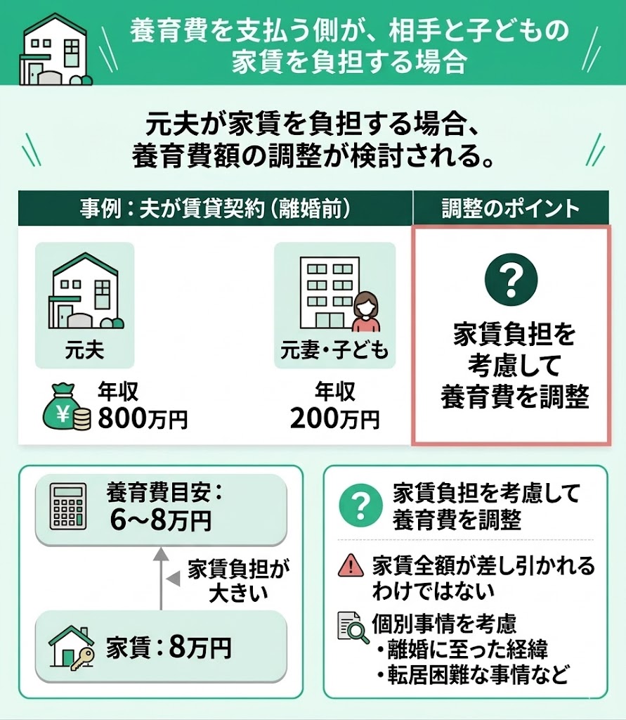 この場合は、元夫が養育費に加えて、妻と子どもの住む家の家賃も負担することになるため、家賃負担を考慮して養育費額を調整することがあります。