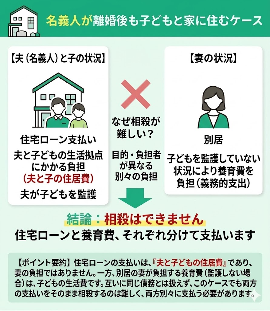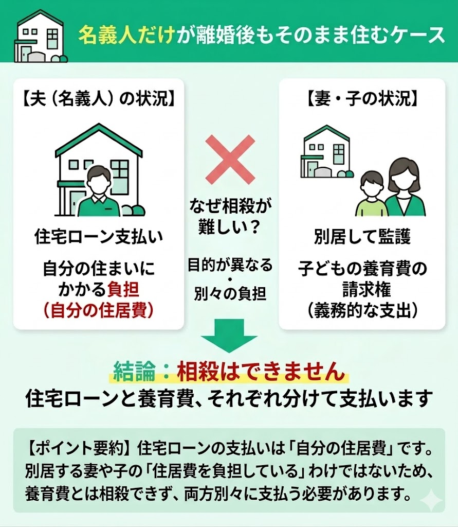 住宅ローンの名義人が夫で、離婚後も夫が子どもと一緒にその家に住み続ける場合も、住宅ローンと養育費の支払いを相殺することは難しいと考えられます。