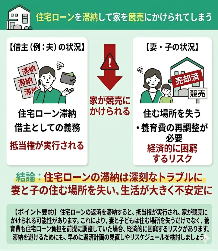 たとえば、夫が妻と子どもの住んでいる家の住宅ローンの返済を滞納したままでいると、抵当権が実行され、家が競売にかけられる可能性があります。