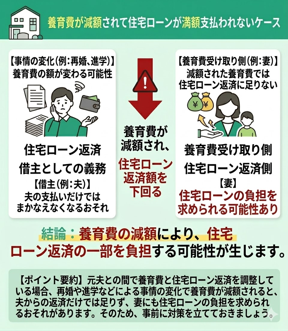 つまり、養育費と住宅ローンの返済を調整している場合、養育費の減額によって、住宅ローンの返済が夫からの支払いだけではまかなえなくなるおそれがあります。