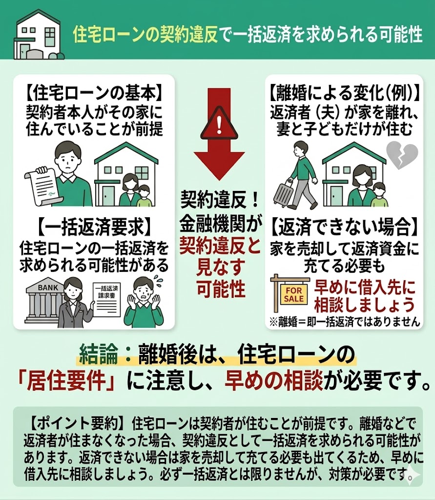 たとえば、夫が住宅ローンの返済者である一方、実際に住んでいるのが妻と子どもだけという場合には、銀行から一括返済を求められる可能性があります。