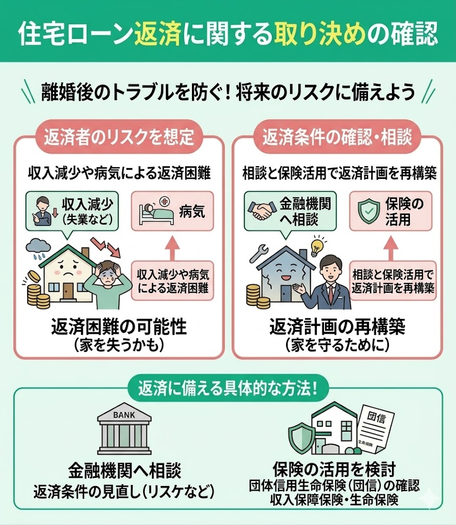 離婚後の住宅ローン返済については、双方で明確な取り決めをしておくことが大切です。あらかじめ整理しておくことで、将来のトラブルを防ぎやすくなります。