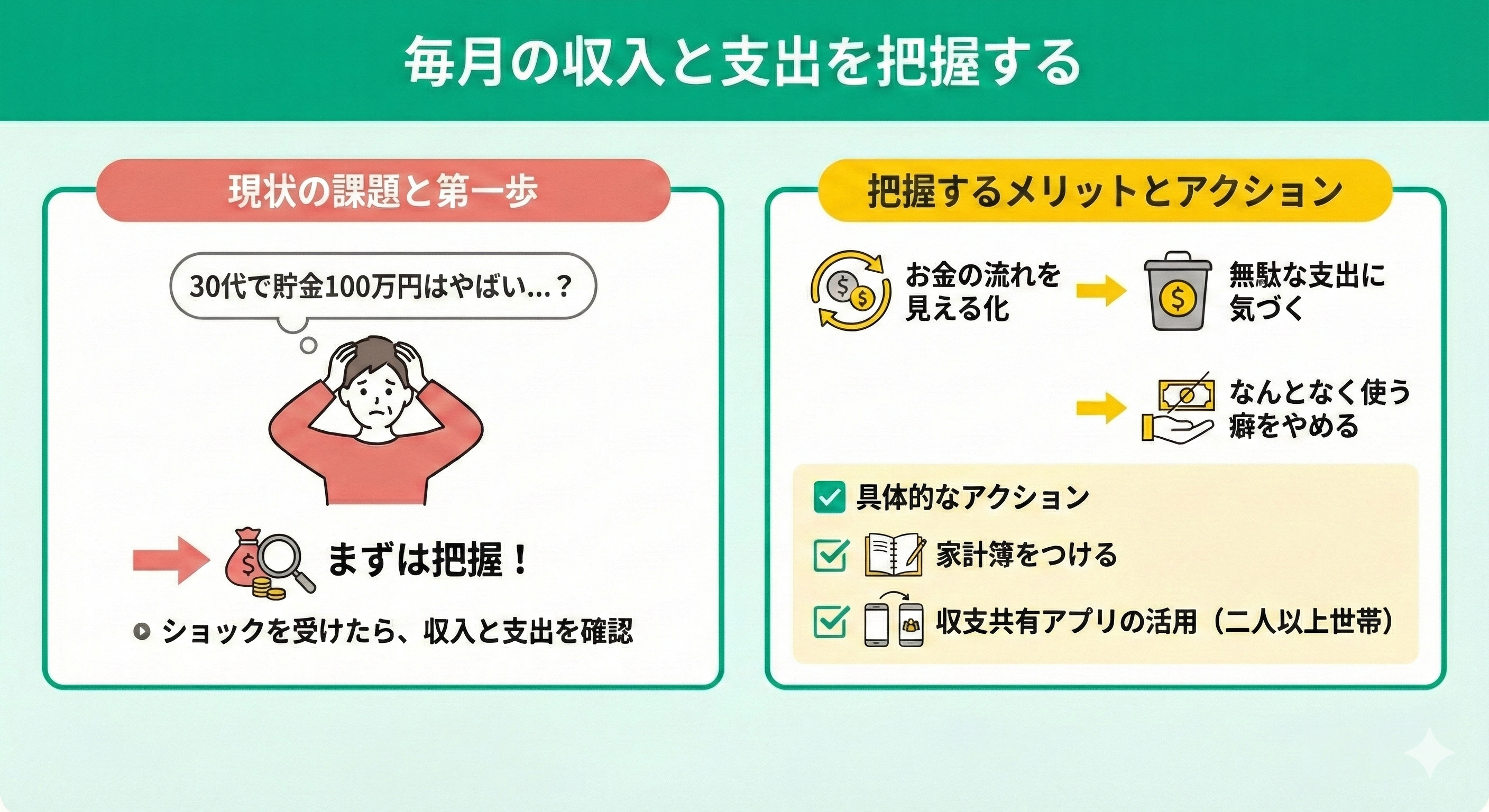「30代で貯金100万円はやばいって言われちゃった…」とショックを受けたら、まず毎月の収入と支出を把握しましょう。