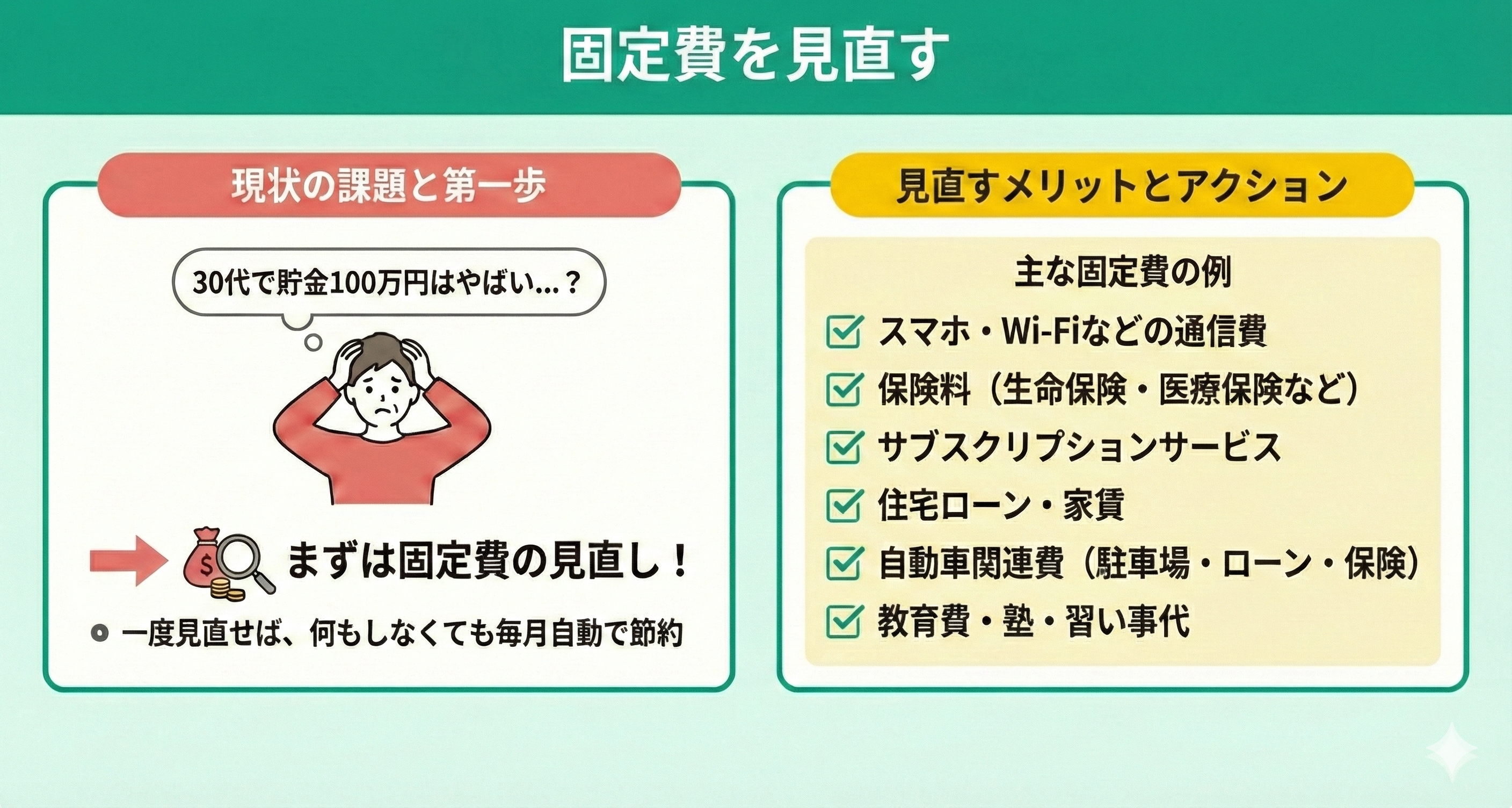 「30代で貯金100万円はやばいって言われちゃった…」とショックを受けたら、ぜひ固定費の見直しをしましょう。