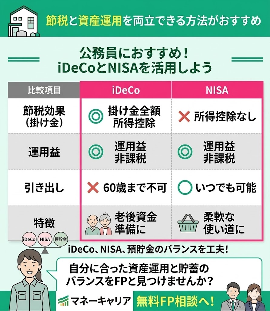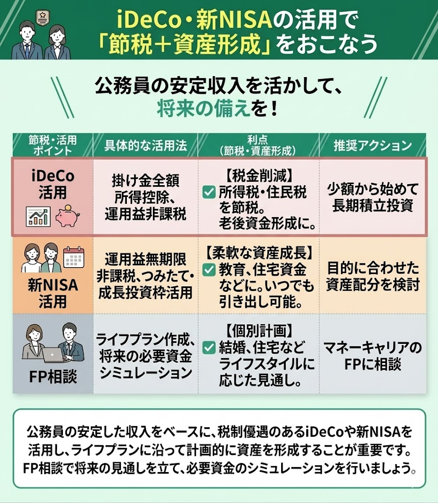 公務員が節税効果を高めるなら、iDeCoやNISAを活用して、節税と資産形成をあわせて進めることが大切です。