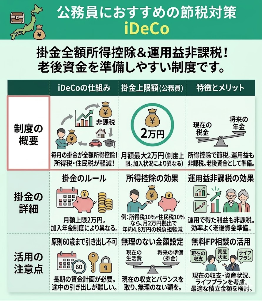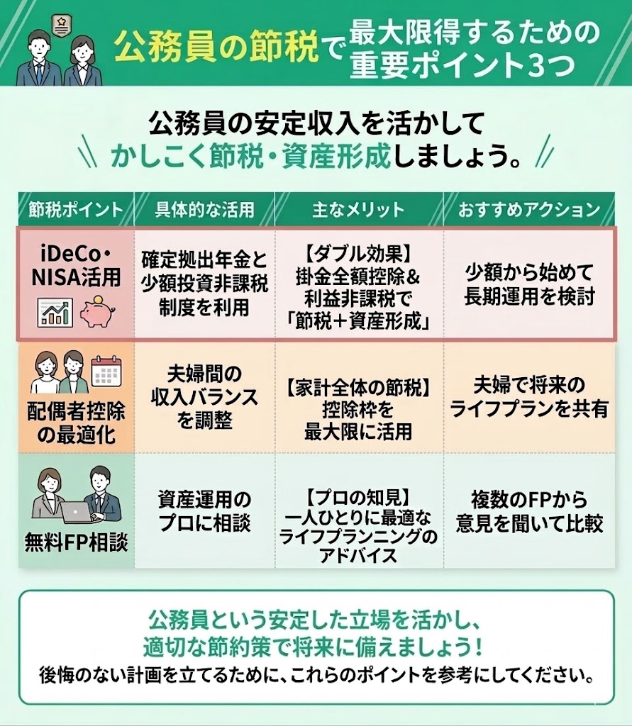 結論、公務員の節税対策では、控除制度を漏れなく活用しながら、iDeCoやNISAも取り入れて“節税と資産形成”をセットで考えることが大切です。