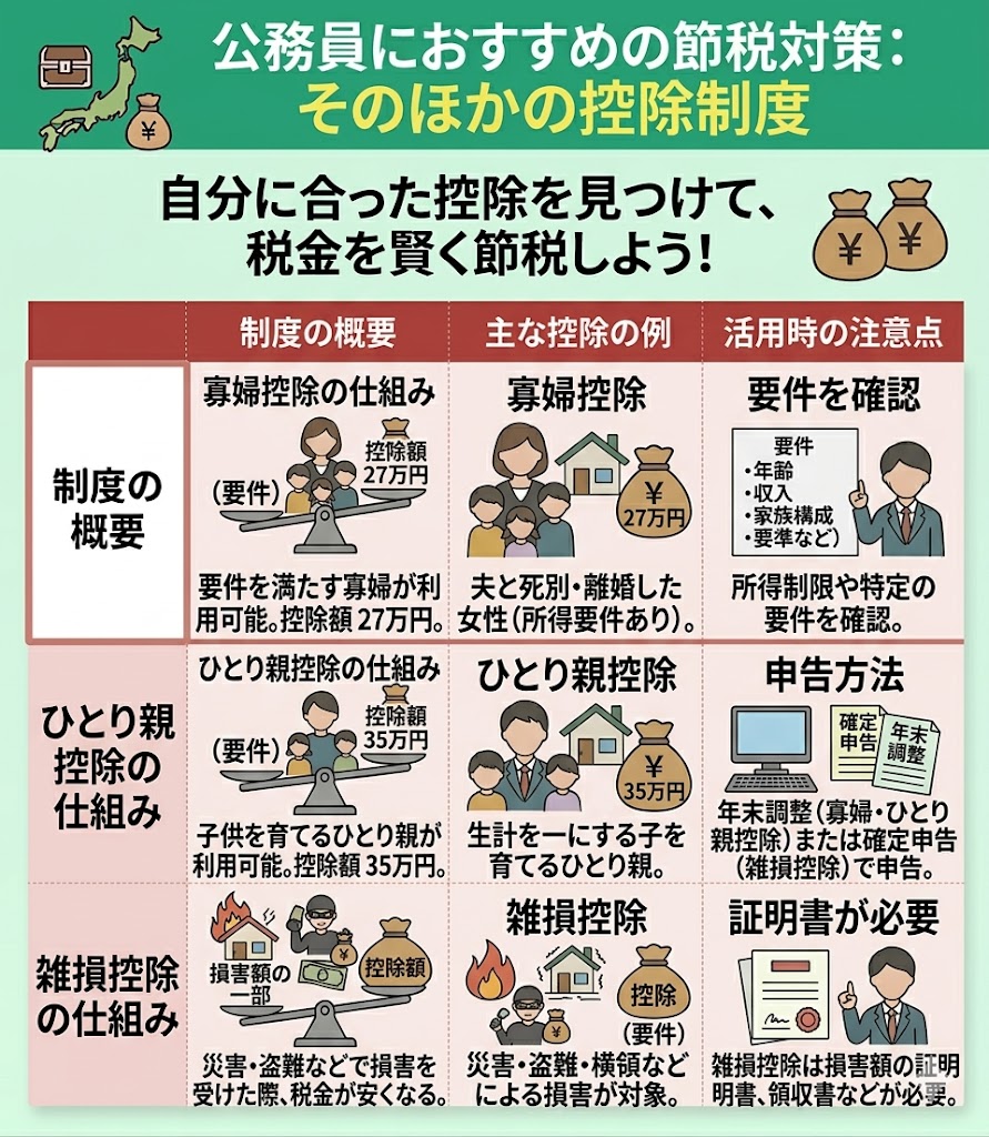 そのほか、公務員が利用できる控除制度として、寡婦控除、ひとり親控除、雑損控除などが挙げられます。