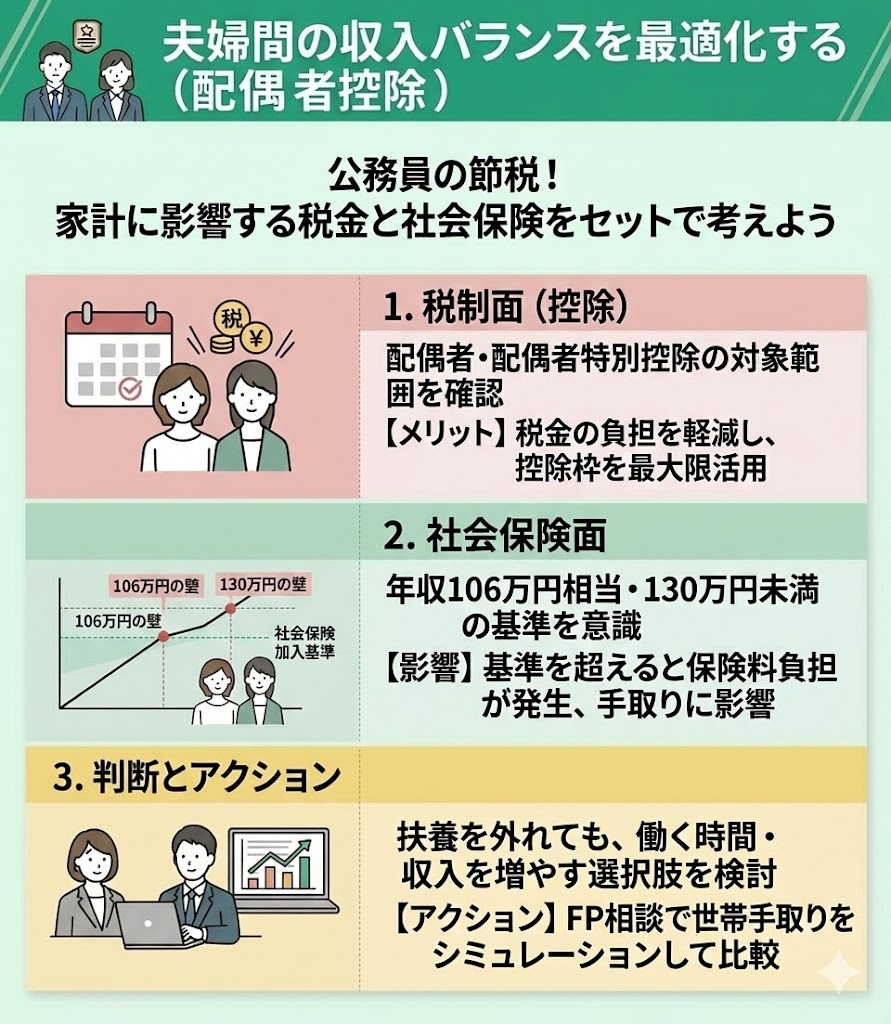 - 夫婦間の収入バランスを最適化する(配偶者控除)