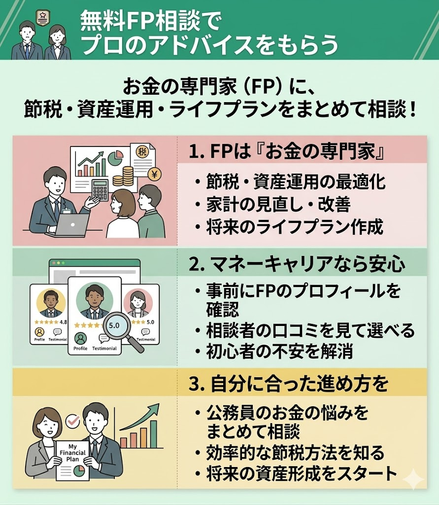 公務員が節税を効率よく進めるためには、無料FP相談を活用してプロのアドバイスを受けるのも有効です。