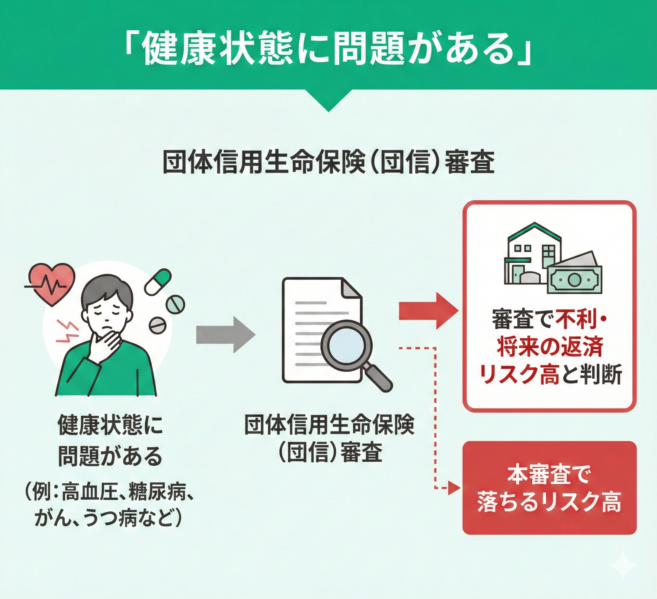この記事では、団体信用生命保険(団信)の審査に通らない主な原因と、具体的な対処法について解説してきました。