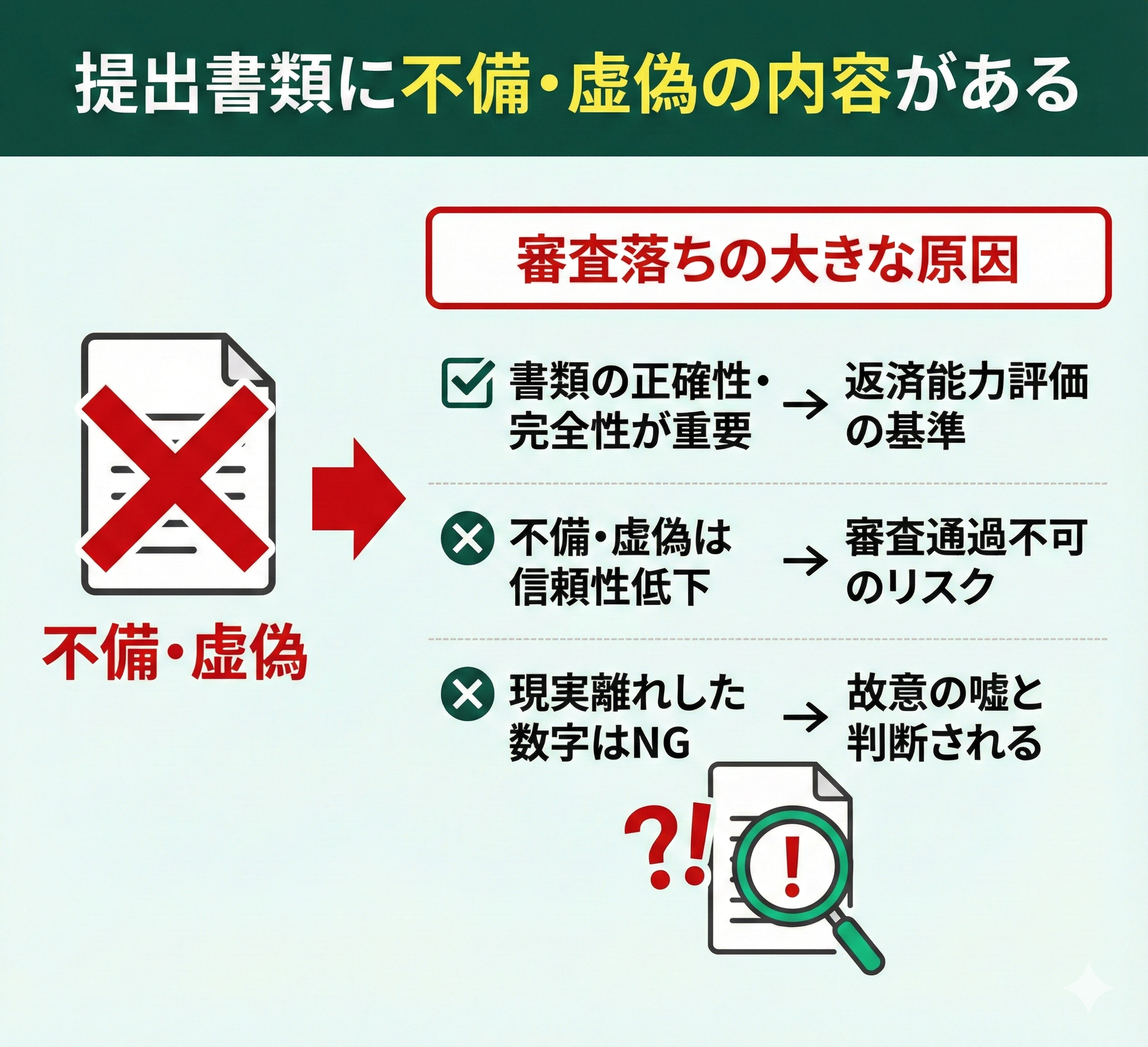 そのため、不備や虚偽があると情報の信頼性が下がってしまい、審査を通過できない可能性があります。