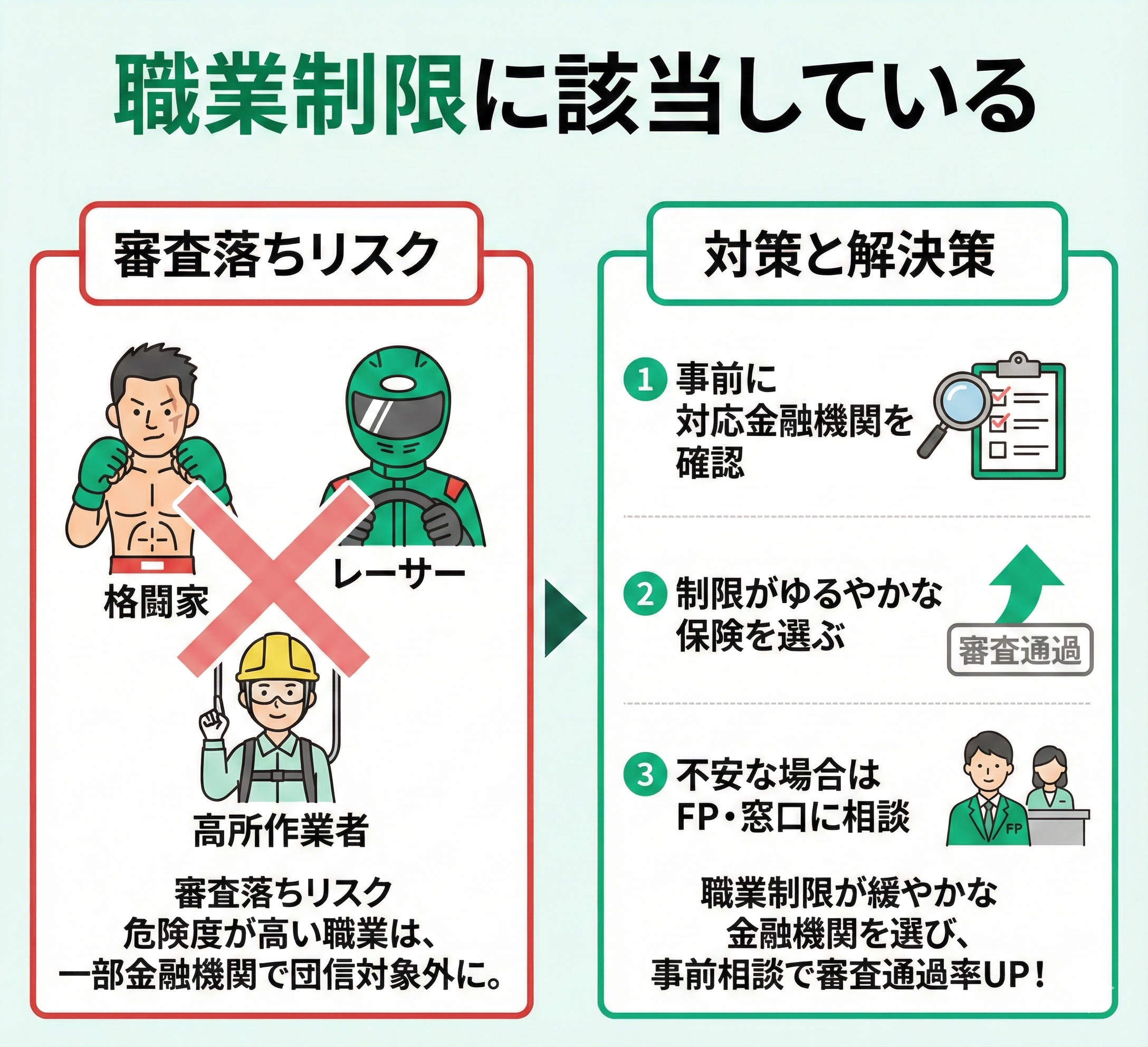団体信用生命保険では、職業制限に該当していると審査に落ちてしまうリスクがあります。