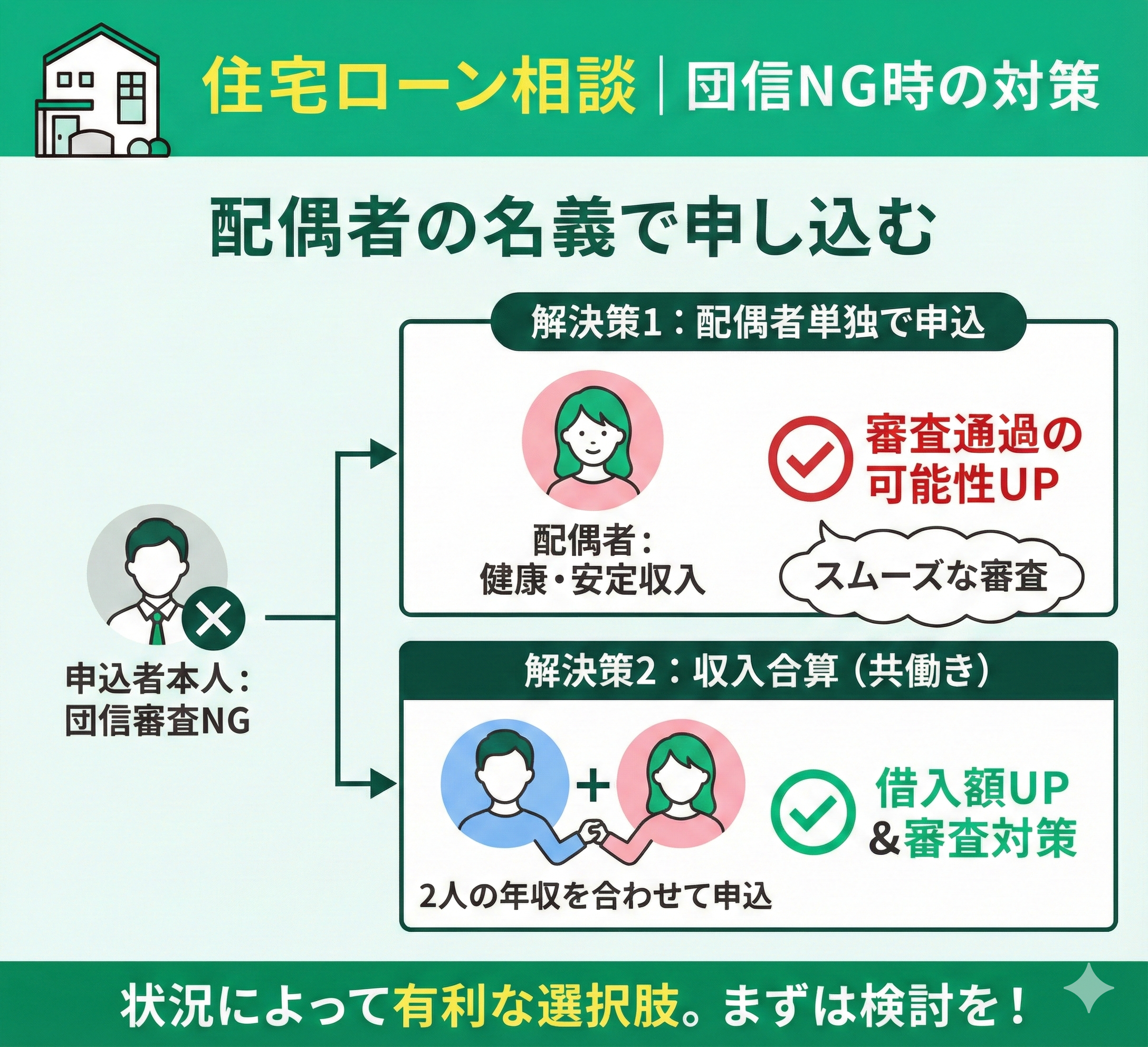 団体信用生命保険の審査に落ちた場合、配偶者の名義で住宅ローンに申し込むのは有効な選択肢の1つです。