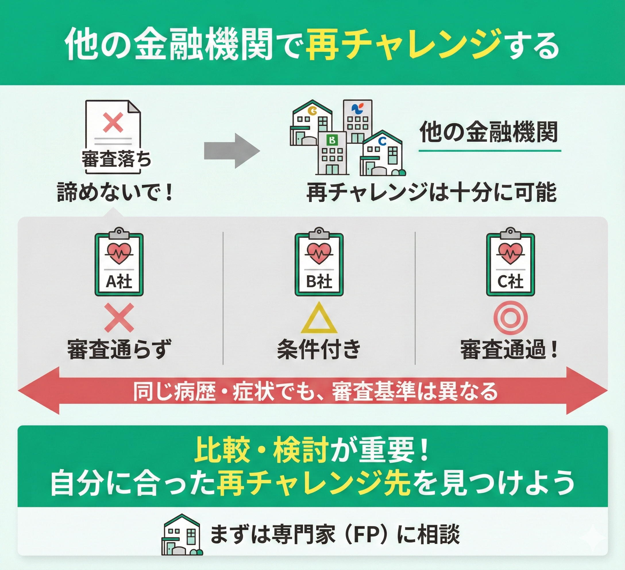 団体信用生命保険の審査に落ちた場合でも、他の金融機関で再チャレンジは十分に可能です。