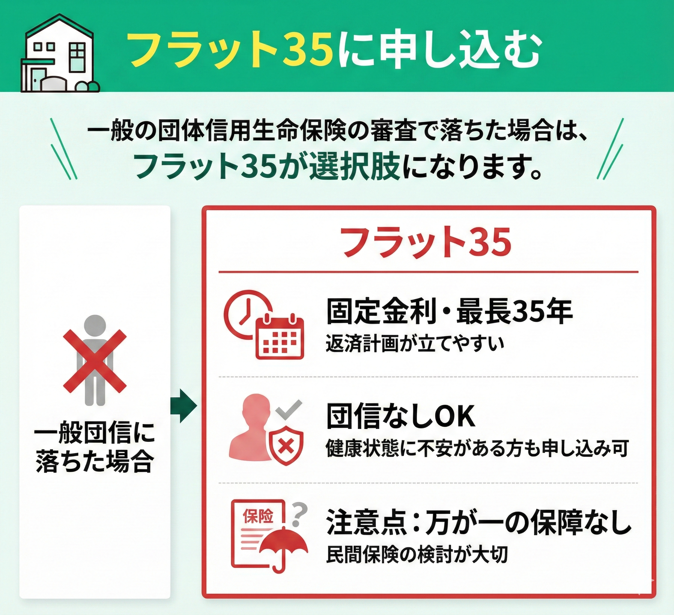一般の団体信用生命保険の審査で落ちた場合は、フラット35に申し込む方法もあります。