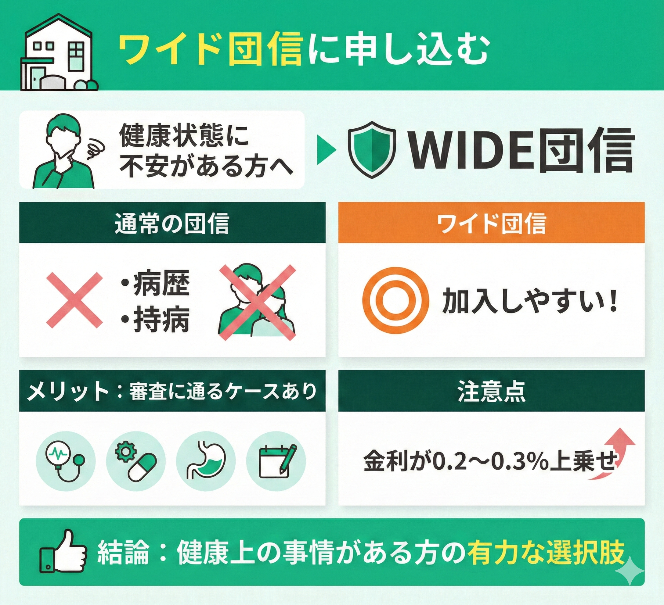ワイド団信は、健康状態に不安がある人でも加入しやすい団体信用生命保険です。