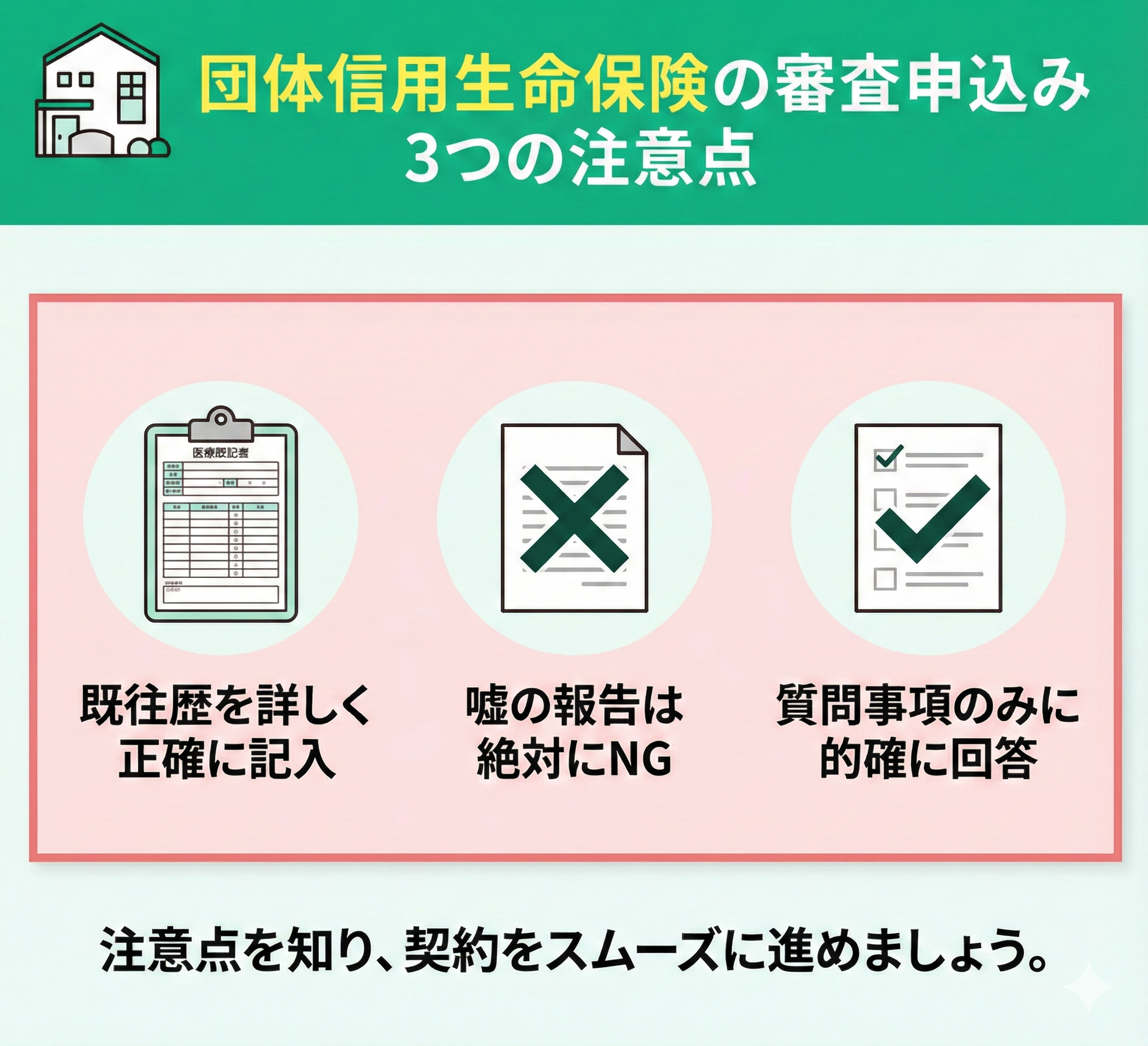 団体信用生命保険の申し込みで気を付けることは次の3つです。