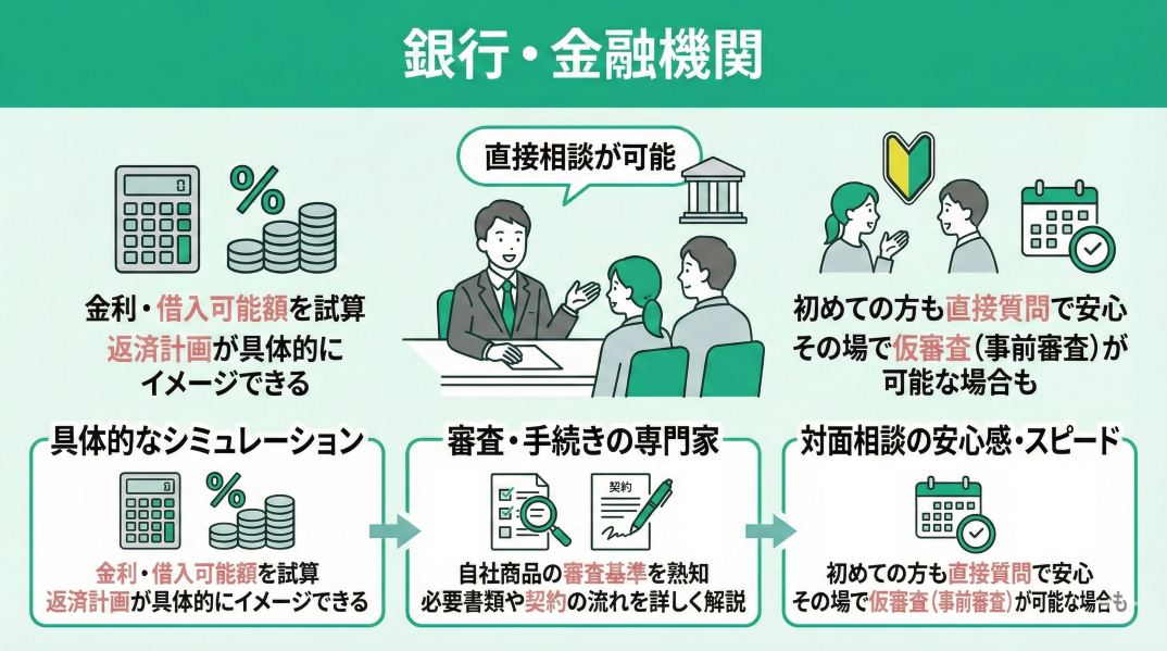 銀行は自社の商品を扱う専門家なので、ローン審査基準や必要書類、金利タイプごとの特徴などについて詳しい説明を受けられます。