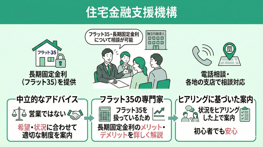 住宅金融支援機構は、フラット35に代表される長期固定金利ローンを提供している独立行政法人です。直接お金を貸す金融機関ではありませんが、フラット35など住宅ローン利用者向けに電話相談窓口や各地の支店での相談対応を行っています。