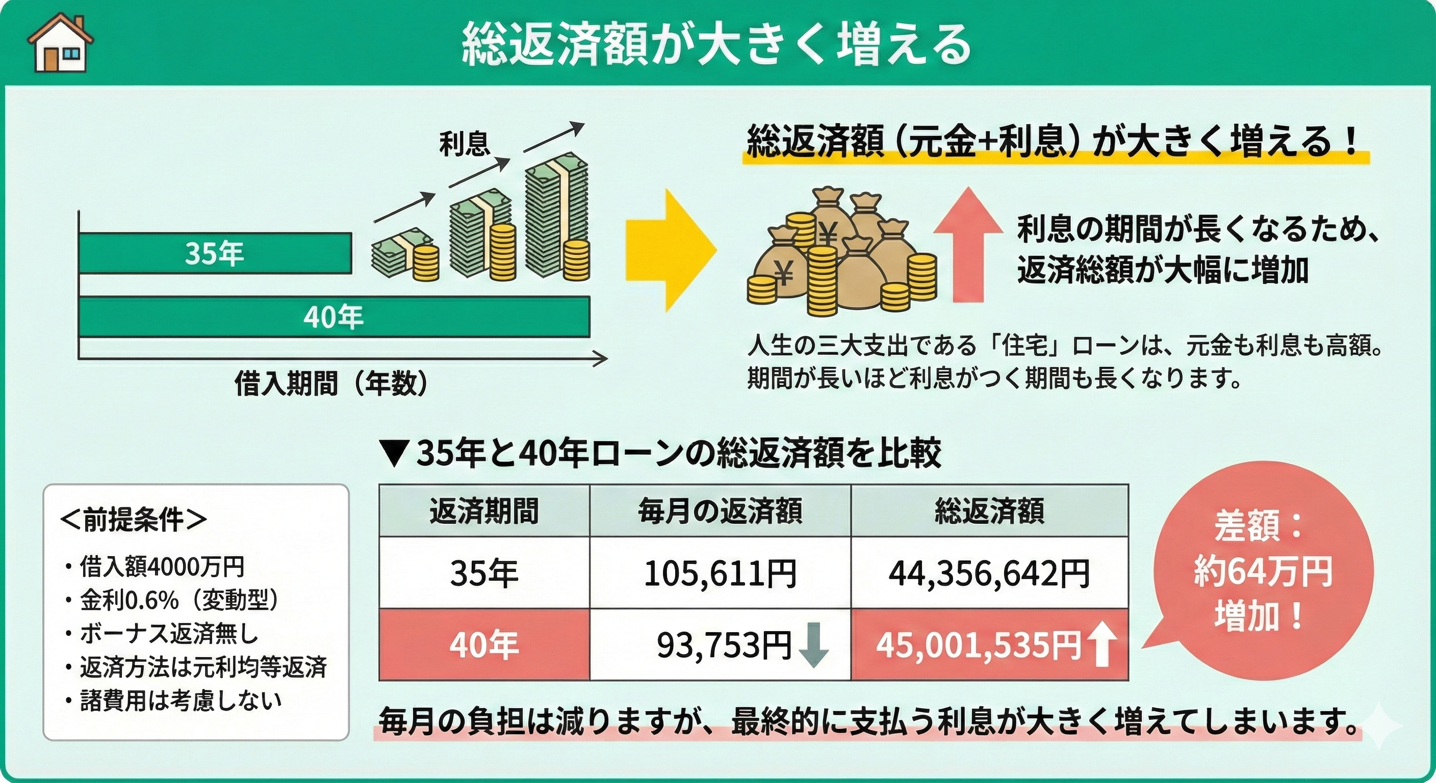 40年ローンが「やばい」と言われる理由の1つめは、総返済額が大きく増えるからです。