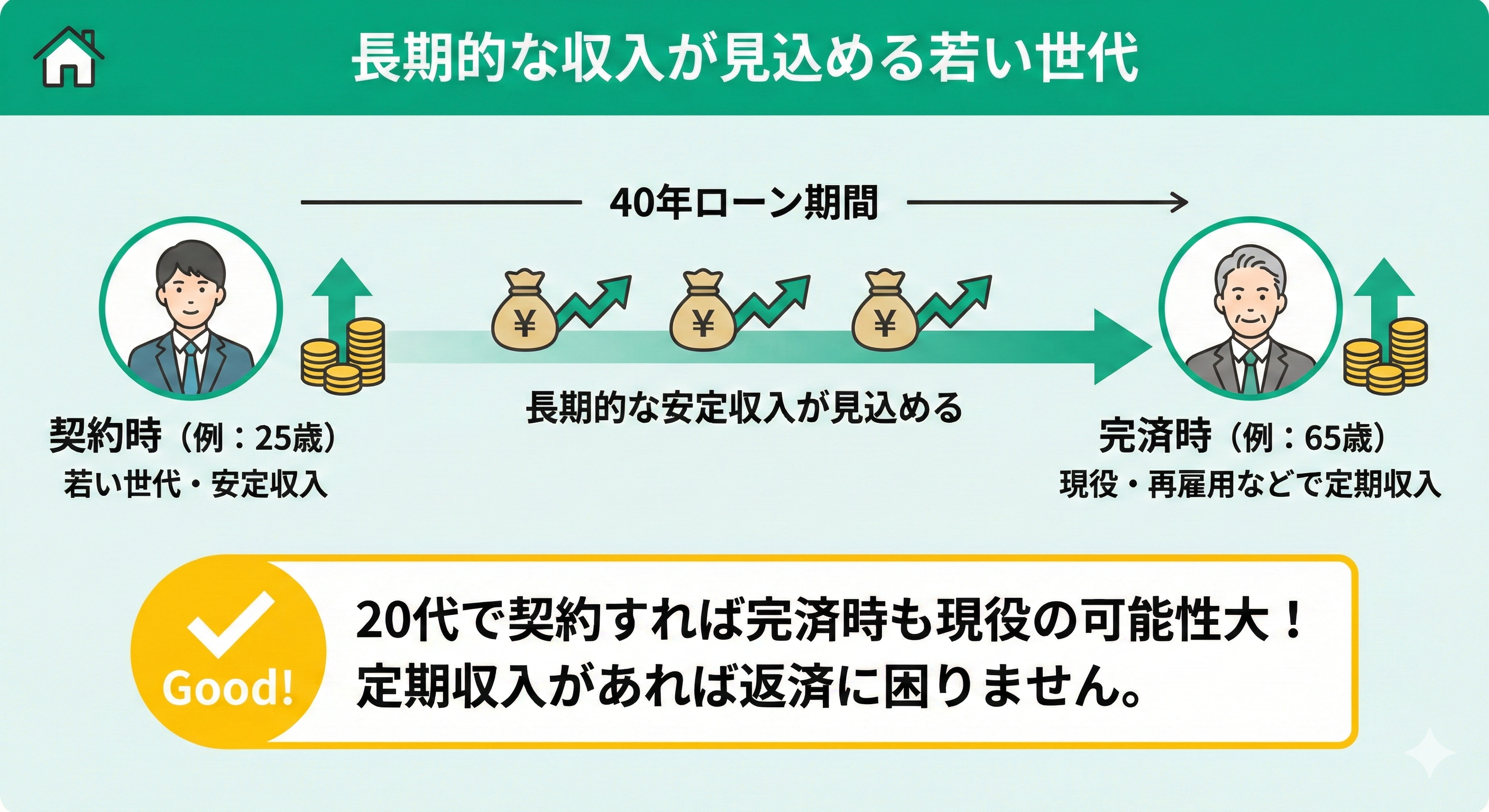 たとえば25歳で40年ローンを契約すれば完済時は65歳。再雇用などで定期収入があれば返済に困りません。