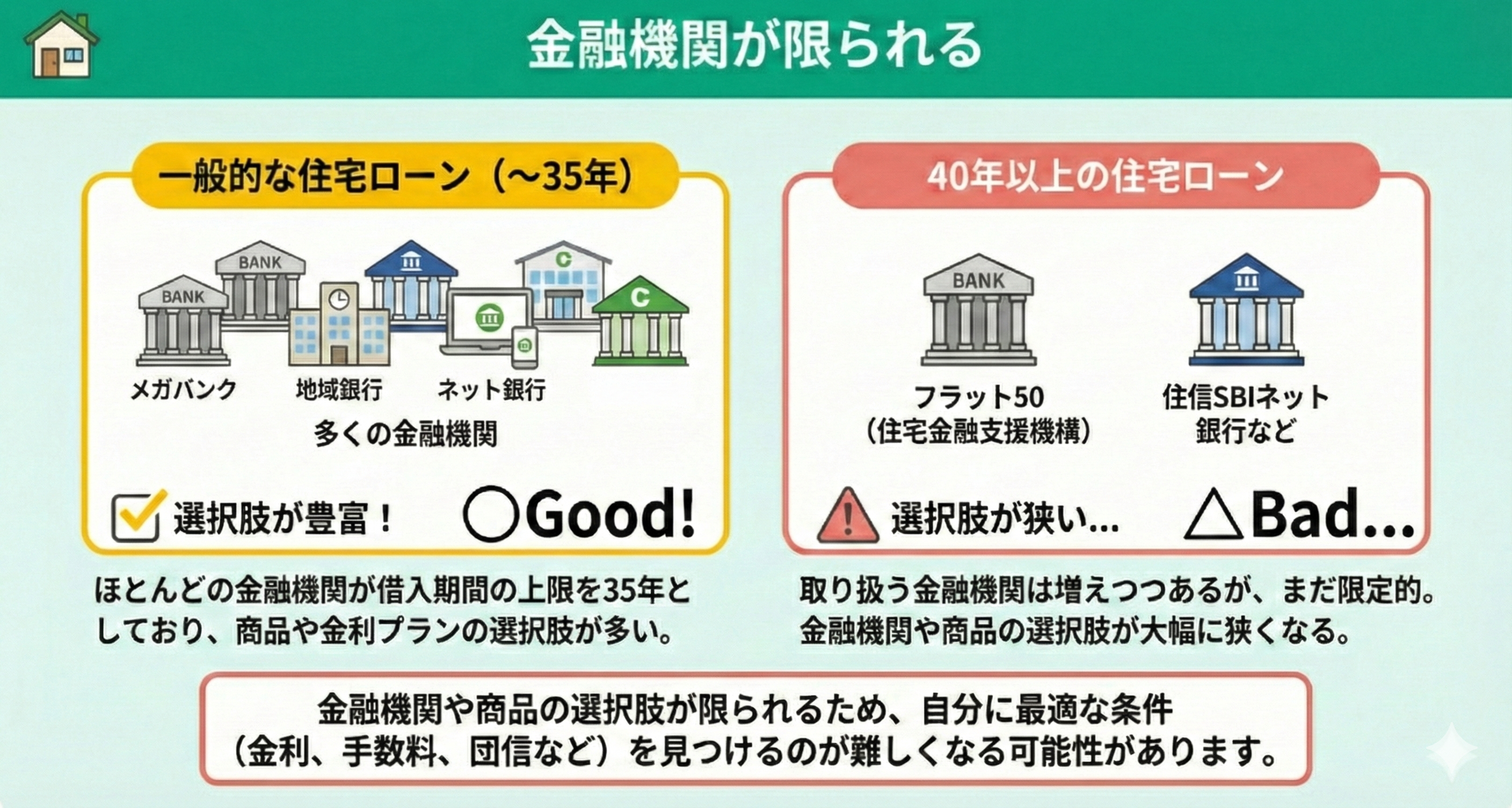 40年ローンが「やばい」と言われる理由の5つめは、金融機関が限られるからです。