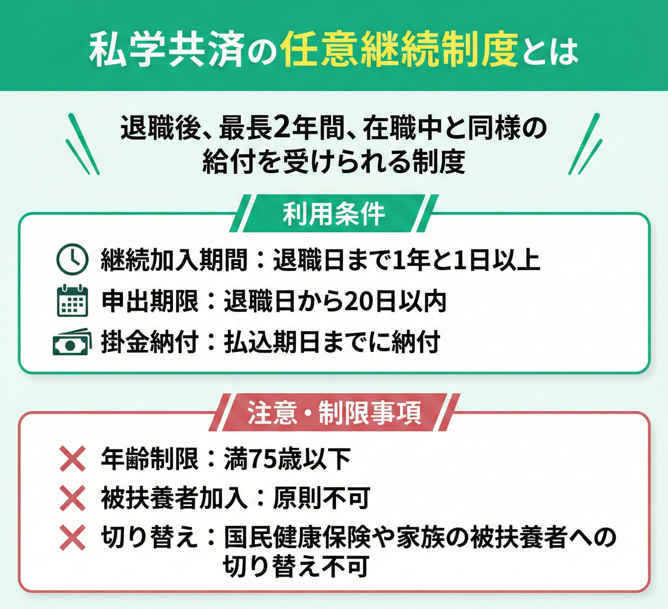 - 私学共済の任意継続とは、退職後も最長2年間、私学共済に加入し続けられる制度
