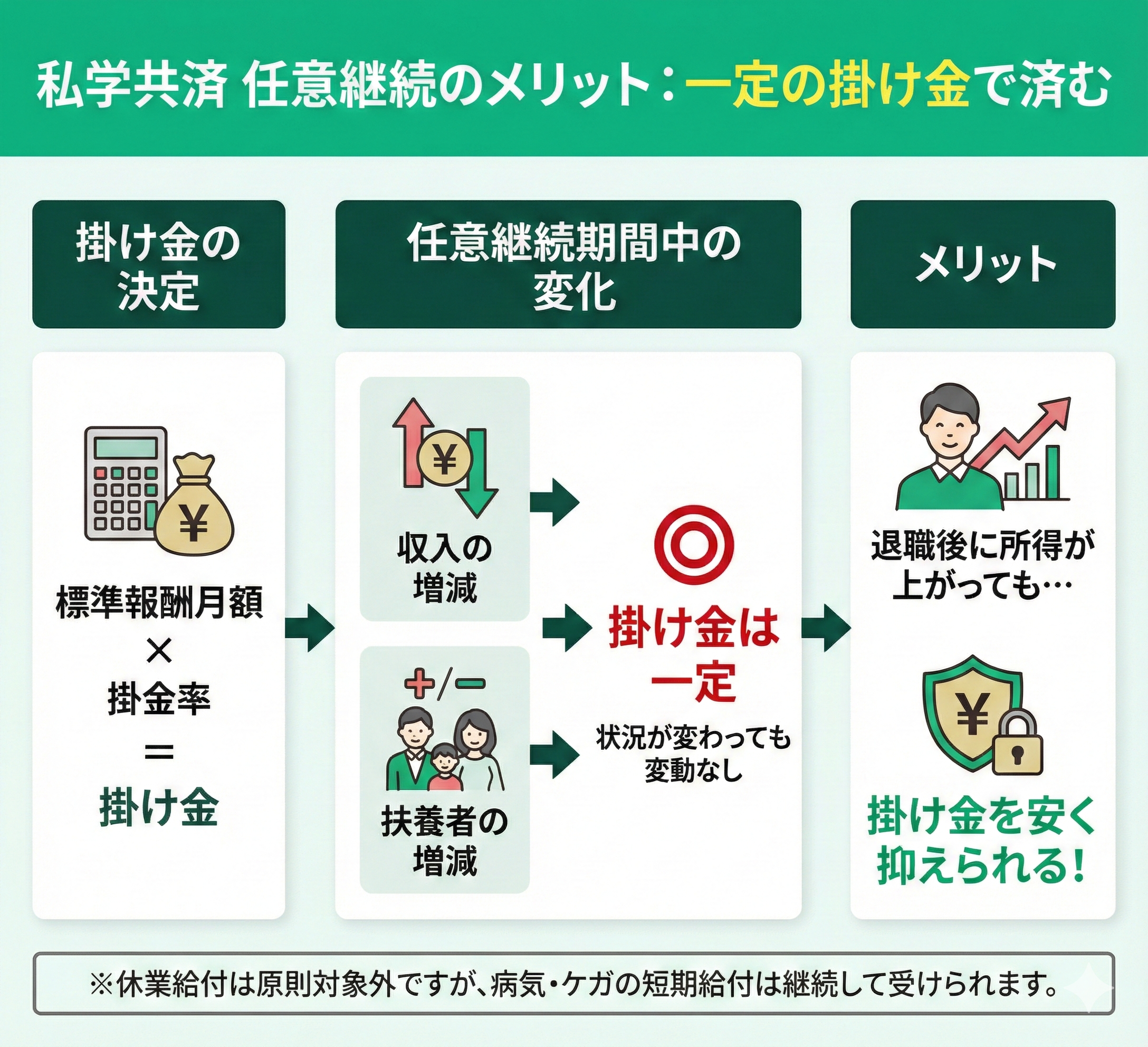 - メリット:掛金が一定、かつ付加給付など独自の厚い保障が継続される