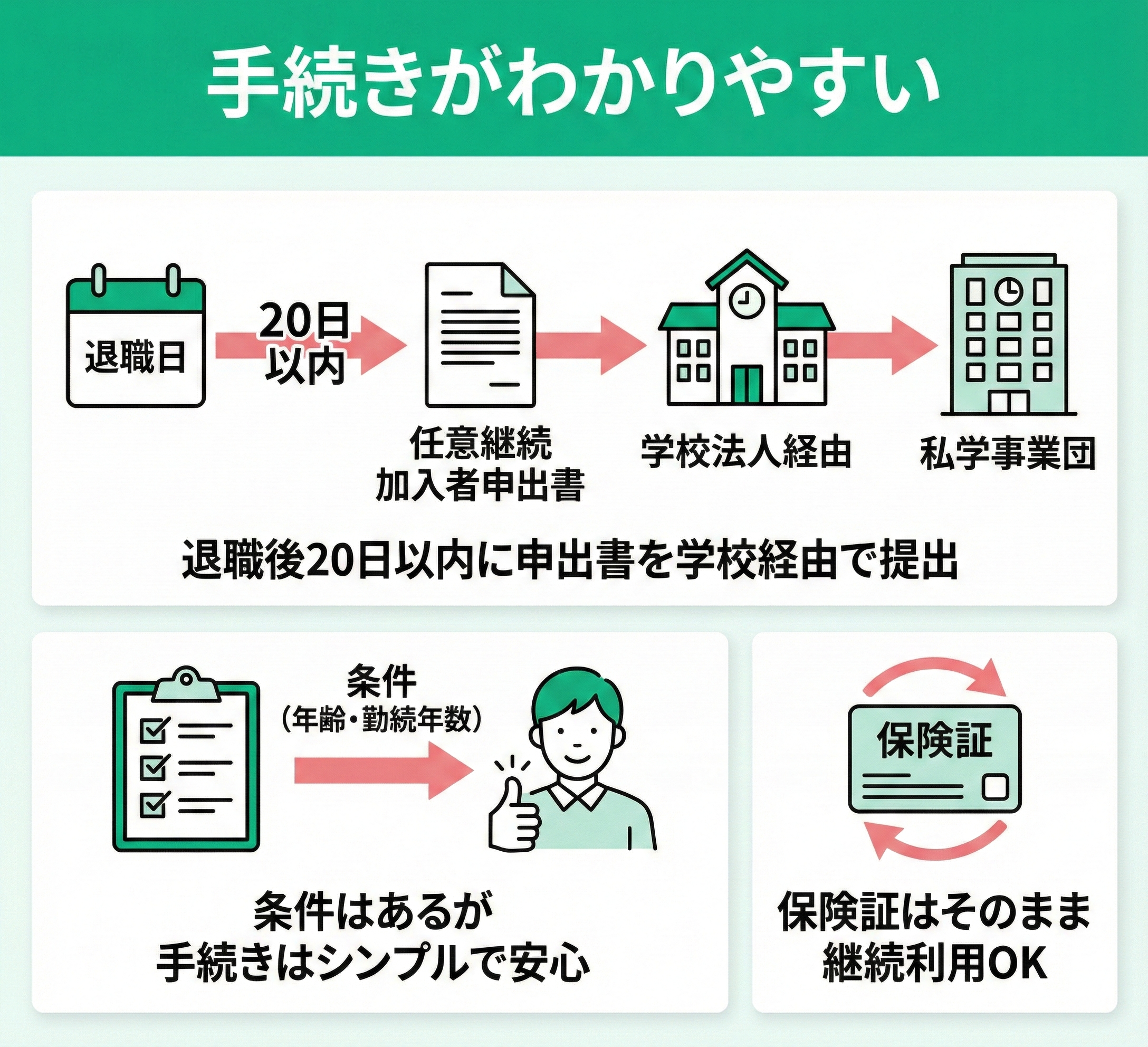 - 退職の日から20日以内に、任意継続加入することを私学事業団に申し出ること